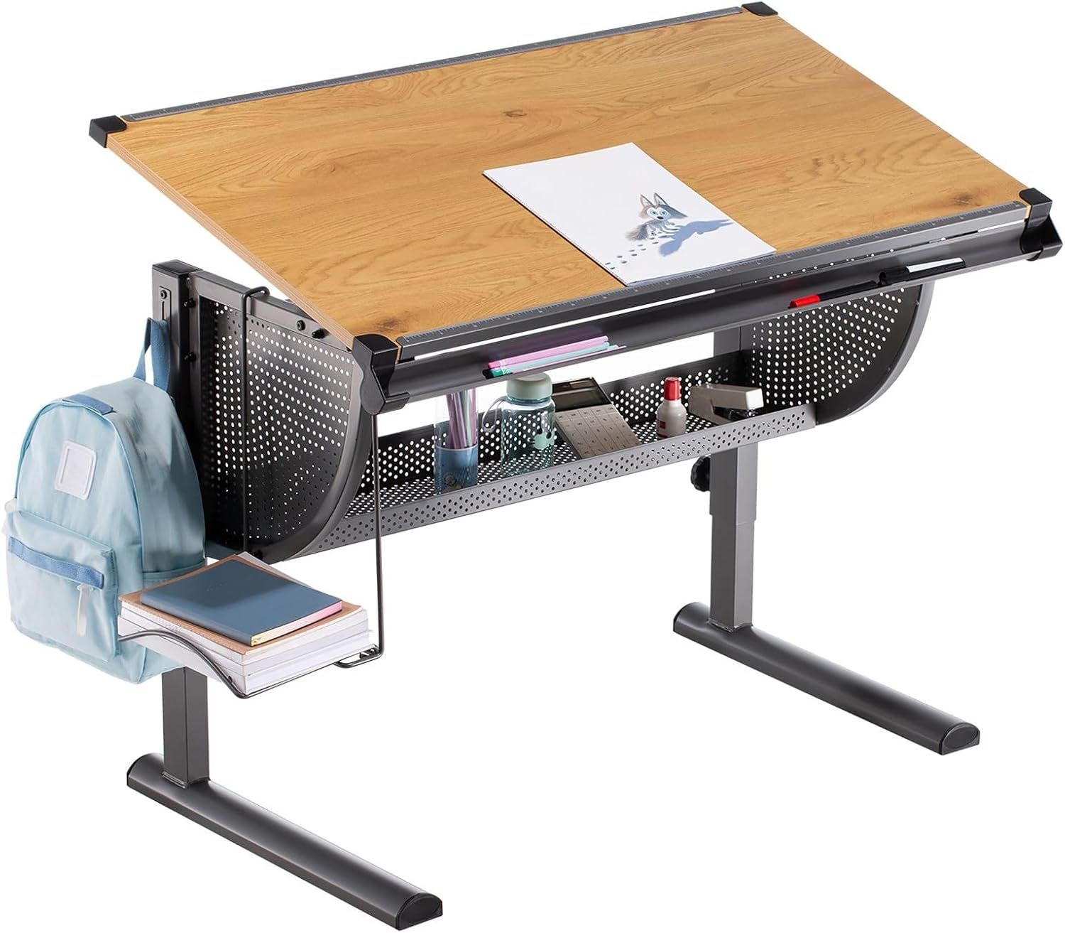Der Kinderschreibtisch Sari bietet eine ergonomische Lösung für Ihr Kind, die sowohl in der Höhe als auch in der Neigung verstellbar ist. Mit einer Mindesthöhe von 62 cm eignet sich der Tisch bereits für Vorschulkinder. Die neigungsverstellbare Tischplatte mit 9 Stufen und einem maximalen Neigungswinkel von 42° fördert eine gesunde Körperhaltung. Eine praktische Rille auf der Arbeitsfläche verhindert das Herunterrollen von Stiften, während seitliche Ablagen für Schulranzen und Bücher sorgen. **Highlights** - Höhenverstellbar von 62 cm bis 93 cm - Neigungsverstellbare Tischplatte mit 9 Stufen - Maximaler Neigungswinkel von 42° - Praktische Rille auf der Arbeitsfläche - Seitliche Ablage für Schulranzen und Bücher **Produkteigenschaften** - Aufbaumaße: 111 x 93 x 60 cm (B x H x T) - Material Tischplatte: MDF in der Farbe Wildeiche - Material Gestell: Metall, Farbe: schwarz - Oberfläche: Lackiert **Lieferumfang** - Kinderschreibtisch Sari inkl. Rucksackhalterung - Kundenfreundliche Montage mit Hilfe der beigelegten Aufbauanleitung - Lieferung erfolgt ohne Dekoration