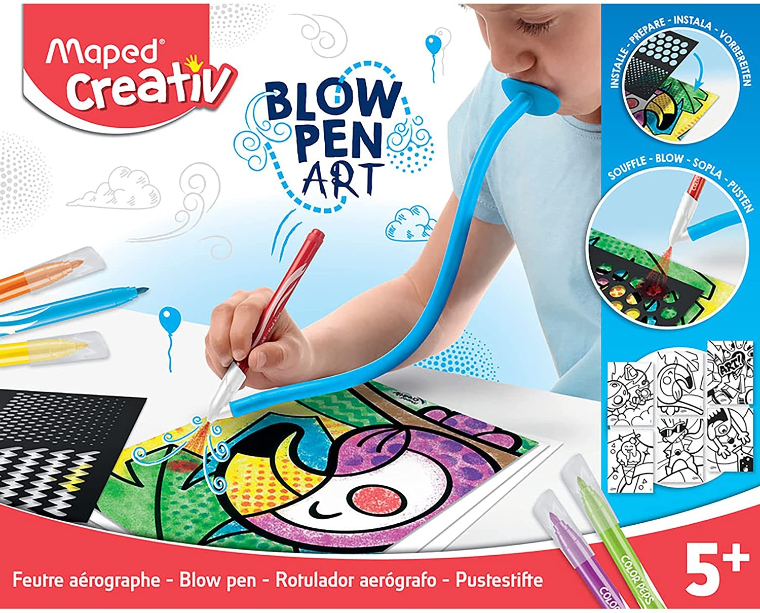 | Beschreibung | Blow Pen Pop Art - Puste Stifte - Maped - Set mit Pustevorrichtung, Stiften, Schablone und Malvorlagen |