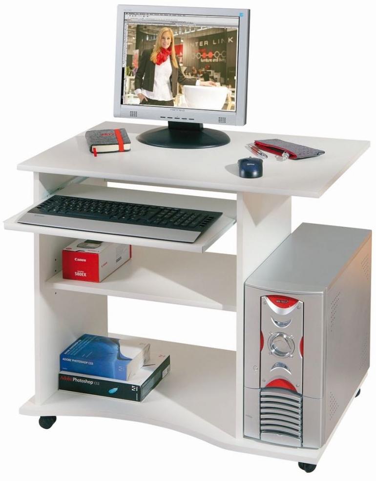 PC-Schreibtisch " PEPE " Äußerst praktische Kombination aus Schreib - und Computertisch. Dank seiner kompakten Abmessungen und der Rollen die optimale Lösung auch für kleinere Raumverhältnisse. melaminbeschichtet, KF-Board, in weiß Gewicht ca. 19 kg ohne Dekoration