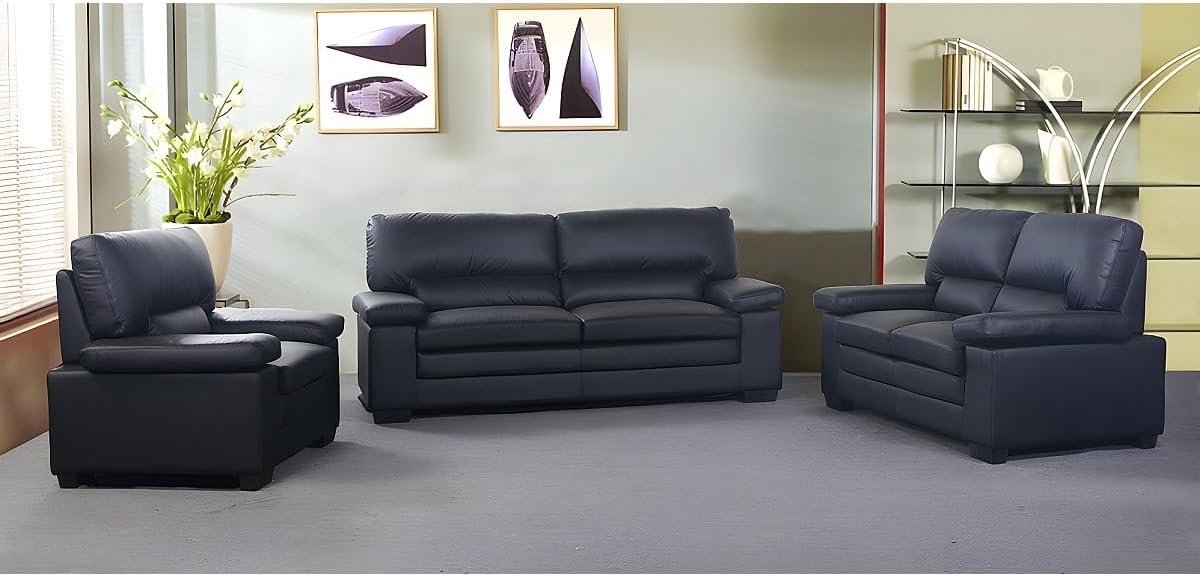 Die Couchgarnitur MIMAS vereint zeitloses Design mit hohem Komfort. Gefertigt aus hochwertigem Büffelleder in Schwarz, bietet sie Platz für bis zu 3 Personen mit einer maximalen Traglast von 360 kg. Die atmungsaktive Polsterung und die robuste Unterfederung sorgen für ein angenehmes Sitzgefühl. Die Garnitur ist als 3-Sitzer, 2-Sitzer oder Sessel erhältlich und lässt sich einfach selbst aufbauen. **Highlights** - Hochwertiges Büffelleder für Langlebigkeit und Stil - Atmungsaktive Polsterung für optimalen Sitzkomfort - Robuste Unterfederung mit Nosagfedern und Spiralfedern - Zeitloses Design, das in jedes Wohnambiente passt - Einfache Selbstmontage **Produkteigenschaften** - Farbe: Schwarz - Material: Leder - Lederart: Büffelleder - Lederqualität: Oberleder - Lederdicke: 1,1 bis 1,2 mm - Struktur: Holz, Furnierplatte - Rückseite & Rahmen: Kunstleder - Polsterung Sitzfläche: Polyurethanschaum - Raumgewicht der Sitzfläche: 32 kg/m³ - Polsterung der Rückenlehne: Polyurethanflocken - Raumgewicht der Rückenlehne: 15 kg/m³ - Maße 3-Sitzer (BxHxT): 210 x 97 x 89 cm - Sitzhöhe: 49 cm - Sitztiefe: 53 cm - Maße 2-Sitzer (BxHxT): 162 x 97 x 89 cm - Sitztiefe: 50 cm - Maße Sessel (BxHxT): 109 x 97 x 89 cm - Maximale Traglast 3-Sitzer: 360 kg - Maximale Traglast 2-Sitzer: 240 kg - Maximale Traglast Sessel: 120 kg **Lieferumfang** - 1 x Sofa ohne Schlafmöglichkeit Gerades 3-Sitzer Sofa MIMAS - 1 x Sofa ohne Schlafmöglichkeit Gerades 2-Sitzer-Sofa MIMAS - 1 x Sessel mit gerader Rückenlehne MIMAS - Selbstmontage erforderlich