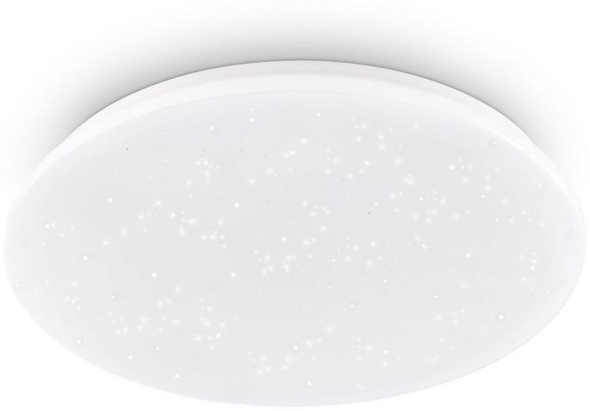 Diese sparsame Wand- und Deckenleuchte ist aus weißem Stahl, sowie weißem Kunststoffschirm mit Kristalleffekt gefertigt und sorgt überall für ein außergewöhnliches Ambiente. Perfekt zum Einsatz in Flur, Küche, Schlafzimmer, Kinderzimmer usw. Diese sparsame Wand- und Deckenleuchte ist aus weißem Stahl, sowie weißem Kunststoffschirm mit Kristalleffekt gefertigt und sorgt überall für ein außergewöhnliches Ambiente. Perfekt zum Einsatz in Flur, Küche, Schlafzimmer, Kinderzimmer usw. Features: UV Beständig Einfache und schnelle Installation Sparsam dank LED Technik Technische Daten: Produkt enthält eine Lichtquelle der Energieeffizienzklasse F (EEK-Spektrum A – G) Betriebsspannung: 230 V~ Gewichteter Energieverbrauch: 36 k Wh/1000 h Leistung: 36 W Lichtfarbe: 4000 K (neutralweiß) Lichtstrom: 3550 lm Lichtausbeute: 98 lm/W Farbwiedergabeindex (CRI): > 80 Ra Abstrahlwinkel: 120° Dimmbar: nein Mittlere Lebensdauer: 25. 000 Stunden Schaltzyklen: 15. 000 Zündzeit: < 1 s Schutzart: IP20 Leistungsfaktor: > 0,56 Quecksilbergehalt: 0,0 mg Material Gehäuse: Stahl Material Schirm: Kunststoff Farbe: weiß Maße (Øx H): 490x55 mm Lieferumfang: LED-Deckenleuchte mit Leuchtmittel (nicht austauschbar) Anleitung