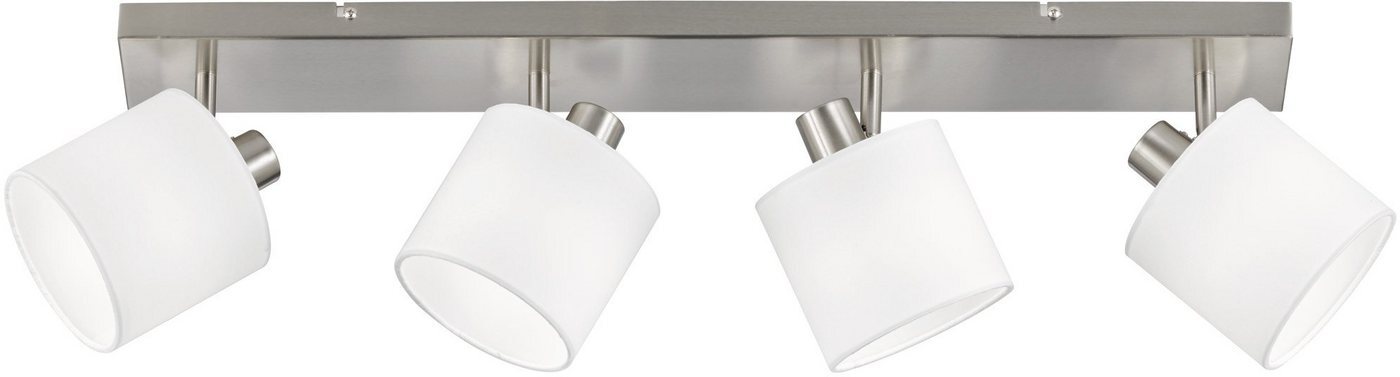 Beschreibung Diese moderne Deckenleuchte ist in nickel-matt und weiß gehalten und lässt sich aufgrund ihres Designs in nahezu jeden Wohnraum integrieren. Alle Spots sind verstellbar, sodass Sie die Beleuchtung des gewählten Wohnraums individuell anpassen können. Ausgestattet mit vier E14 Fassungen können Sie Leuchtmittel mit einer maximalen Leistung von je 28 Watt in die Leuchte einfügen und somit selbst über die Lichtfarbe und -stärke entscheiden. Aufgrund von Langlebigkeit und Energieersparnis empfehlen wir die Verwendung von LED Leuchtmitteln. Die Leuchtmittel sind nicht im Lieferumfang enthalten. Details Leuchte • Lampentyp: Deckenstrahler• Material: Metall, Textil• Farbe: nickel matt, weiß• bewegliche Spots• Schutzart: IP20• Länge x Breite x Höhe in cm: 70 x 9 x 19• Durchmesser x Länge Spot in cm: 12 x 11 • Fassungen: 4x E14• Leuchtmittel enthalten: Nein• Leistung Leuchtmittel: max. 4x 28 Watt• Stromversorgung: 220-240V, 50-60Hz
