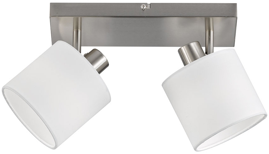 Beschreibung Diese moderne Deckenleuchte besteht aus nickel mattem Metall und zwei weißen Lampenschirmen aus Textil. Aufgrund ihres Designs lässt sich die Leuchte in nahezu jeden Wohnraum integrieren. Die Spots sind verstellbar, sodass Sie die Beleuchtung des gewählten Wohnraums individuell anpassen können. Ausgestattet mit zwei E14 Fassungen können Sie Leuchtmittel mit einer maximalen Leistung von je 28 Watt in die Leuchte einfügen und somit selbst über die Lichtfarbe und -stärke entscheiden. Aufgrund von Langlebigkeit und Energieersparnis empfehlen wir die Verwendung von LED Leuchtmitteln. Die Leuchtmittel sind nicht im Lieferumfang enthalten. Details Leuchte • Lampentyp: Deckenstrahler• Material: Metall, Textil• Farbe: nickel matt, weiß• bewegliche Spots• Schutzart: IP20• Länge x Breite x Höhe in cm: 28 x 17,6 x 19• Durchmesser x Länge Spot in cm: 12 x 11 • Fassungen: 2x E14• Leuchtmittel enthalten: Nein• Leistung Leuchtmittel: max. 2x 28 Watt• Stromversorgung: 220-240V, 50-60Hz
