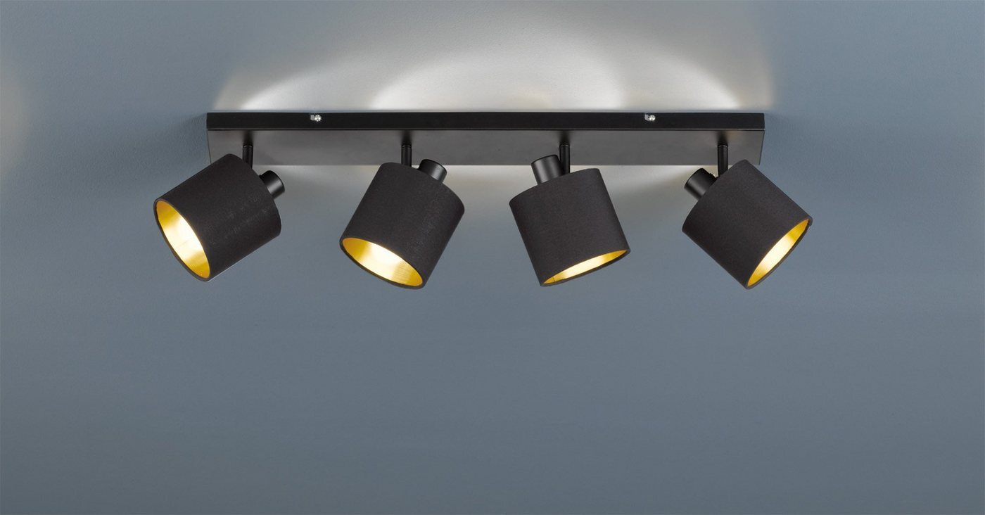 **Die Spots der Serie TOMMY stehen für ein wohnliches Licht, da Textilschirme den Behaglichkeitsfaktor erhöhen und ein gemütliches Ambiente zaubern. Zeitgleich zaubern die klaren Formen einen modernen und schlichten Stil, der sich vielseitig einsetzen und kombinieren lässt. Der vierflammige Spot hat eine Breite von 70 cm und kann optimal für die Ausleuchtung von Wohn- und Schlafräumen oder einem länglichen Flur eingesetzt werden. Die schwenkbaren Köpfe lassen sich zudem gezielt ausrichten, um einzelne Bereiche bewusst in Szene setzen. Die Leuchte ist aus schwarz matten Metall hergestellt und wird durch vier Stoffschirme in der modernen Farbkombination schwarz und gold ergänzt. Die Kombination schafft stilvolle Lichtakzente und verleiht Wohnräumen einen außergewöhnlichen Wohlfühleffekt. Für eine energiesparende Beleuchtung empfiehlt sich die Verwendung eines LED Leuchtmittels. Diese sind eine optimale Alternative zu herkömmlichen Halogen Leuchtmitteln und stehen für eine hohe Lichtqualität und eine Energieeinsparung von bis zu 80%. Zusätzlich profitieren Sie bei LED Leuchtmitteln von einer langen Lebensdauer, einer geringen Wärmeentwicklung und schonen gleichzeitig die Umwelt.** **Ausführung** Material: Metall/Stoff Farbe: schwarz matt/Stoff schwarz/gold 4xE14 max.40W **Maße** Breite: 70cm Höhe: 19cm Tiefe: 17cm **Lieferumfang** 1 Deckenleuchte ohne Leuchtmittel **Hinweis** Für den Betrieb sind 4 Leuchtmittel für Fassung E14 erforderlich Diese Leuchtmittel sind im Lieferumfang nicht enthalten