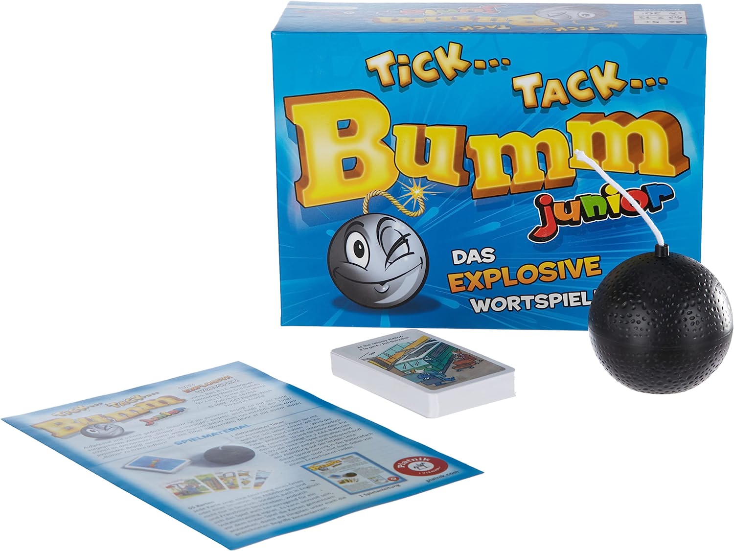 ### Wortspiel unter Zeitdruck Tick Tack Bumm Junior ist ein lustiges Wortspiel für zwei bis zwölf Personen und auf jeder Party der absolute Hit. Der Reihe nach nennen die Spieler verschiedene Begriffe, die sie mit einem Oberbegriff assoziieren. Doch aufgepasst, die Spieler dürfen nicht zu lange überlegen, denn die Zeitbombe droht zu explodieren. ### So wird gespielt In der Mitte liegt ein verdeckter Kartenstapel, von dem nach jeder Runde eine neue Karte aufgedeckt wird. Auf den Karten stehen Oberbegriffe, wie beispielsweise „Im Wald“, „Im Koffer“ oder „Im Park“. Die Spieler nennen nun nach und nach Wörter, die sie mit dem Oberbegriff assoziieren. Der Clou an Tick Tack Bumm: Der Spieler, der gerade an der Reihe ist, hält eine tickende Zeitbombe in der Hand, die jeden Moment explodieren könnte. Deshalb muss er schnell einen Begriff nennen, um die Bombe an den nächsten Spieler weitergeben zu können. Der Spieler, der die Bombe in der Hand hält sobald sie explodiert, hat die erste Runde verloren.