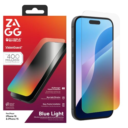 ZAGG InvisibleShield Glass Elite VisionGuardDisplayschutz aus gehärtetem Glas für iPhone 16 und iPhone 15 [6.1-Inch], kratzfest, Blaulichtfilter, schmutzabweisend, stossfest (Transparent)