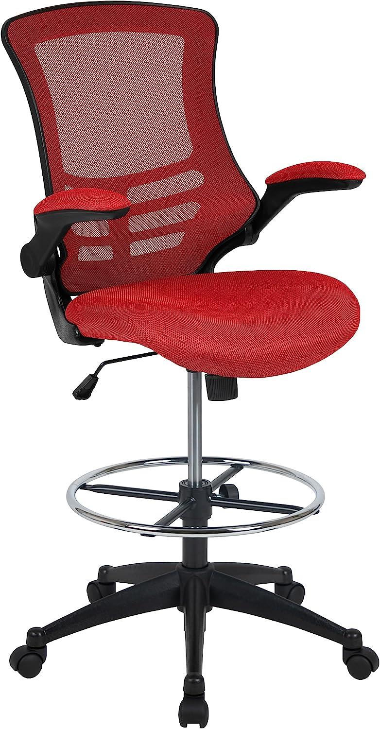 Der Flash Furniture Zeichenstuhl vereint modernes Design mit ergonomischen Funktionen, ideal für Büro und Zuhause. Die belüftete, gebogene Rückenlehne bietet optimale Lendenwirbelstütze und Atmungsaktivität. Der voll drehbare Sitz und der höhenverstellbare Chrom-Fußring ermöglichen eine individuelle Anpassung, während die Druckentlastung Wasserfallkante zusätzlichen Komfort bietet. Die Neigungsfunktion sorgt für eine ergonomische Sitzposition. **Highlights** - Belüftete gebogene Rückenlehne für optimale Lendenwirbelstütze und Atmungsaktivität - Voll drehbarer Sitz für maximale Flexibilität - Höhenverstellbarer Chrom-Fußring für individuelle Anpassung - Druckentlastung Wasserfallkante für zusätzlichen Komfort - Neigungsfunktion für eine ergonomische Sitzposition **Produkteigenschaften** - Gesamtmaße: 62,23 cm B x 64,77 cm T x 109,86-128,91 cm H - Sitzgröße: 51,44 cm B x 48,26 cm T x 58,42-76,20 cm H - Rückengröße: 41,38-50,8 cm B x 58,42 cm H - Armgröße: 80,01-99,06 cm H vom Boden; 20,32 cm H vom Sitz - Fußring Größe: 50,8 cm Durchmesser