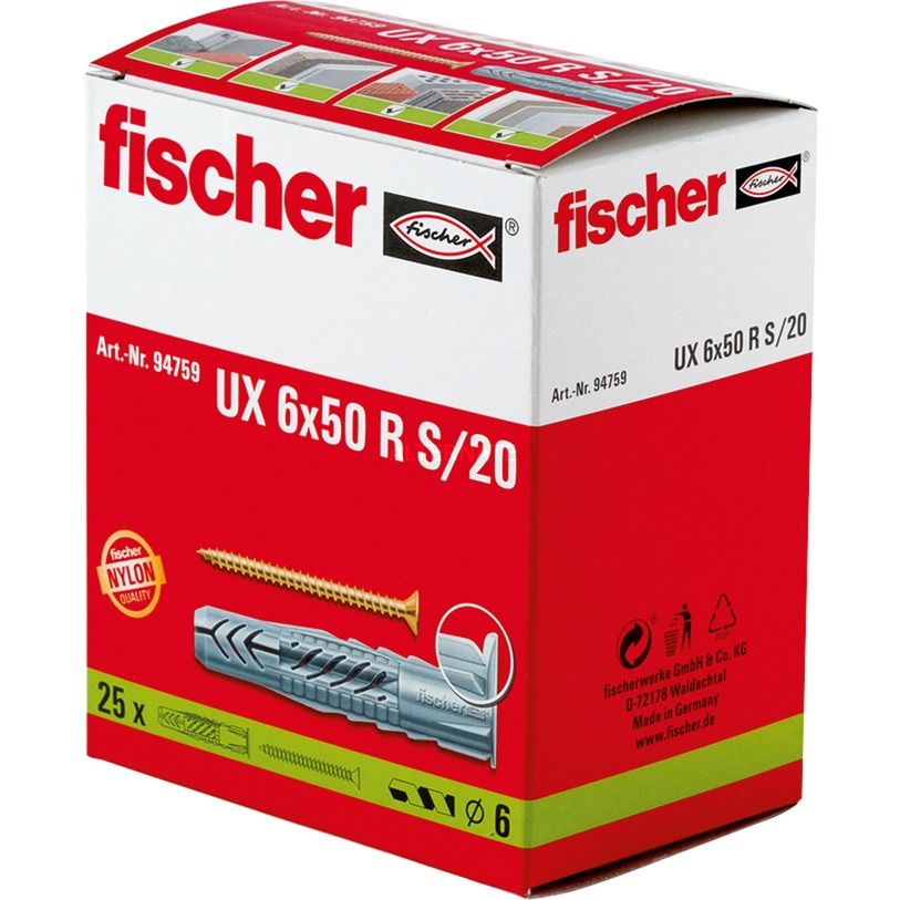 Der fischer Universaldübel UX 6 x 50 R S/20 mit Rand und Schraube ist ein hochwertiges Produkt, das sich durch seine einfache Anwendung und starke Verankerung auszeichnet. Mit diesem Dübel können Sie schnell und einfach Gegenstände an fast jedem Mauerwerk befestigen - sei es eine Lampe oder ein Vorhang.