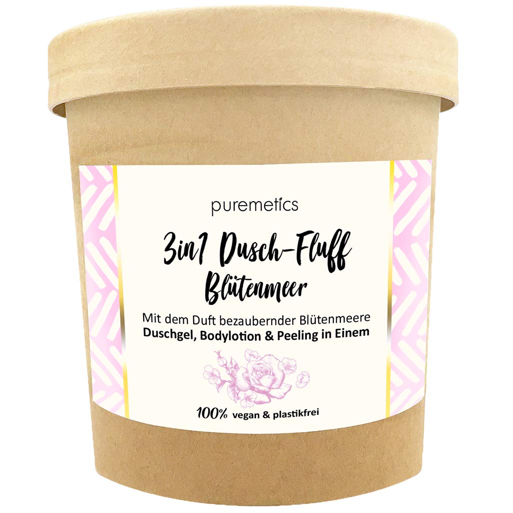 Der puremetics 3in1 Dusch-Fluff kombiniert Duschgel, Peeling und Lotion in einem Produkt. Viele Nutzer schätzen den angenehmen Duft und die pflegende Wirkung auf der Haut. Allerdings gibt es auch Kritik an der Verpackung, die sich bei Nässe auflöst, sowie an der mangelnden Langzeitwirkung des Duftes und des Peelingeffekts. Einige Anwender vermissen das Gefühl, gut eingecremt zu sein.
