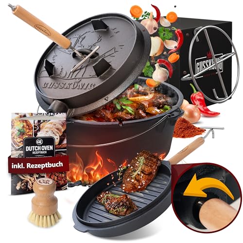 Der GUSSKÖNIG Dutch Oven ist ein vielseitiges und qualitativ hochwertiges Kochgeschirr, das sowohl zum Kochen als auch zum Brotbacken verwendet werden kann. Das Set kommt mit nützlichem Zubehör und bietet ein gutes Preis-Leistungs-Verhältnis. Allerdings ist die Größe möglicherweise für größere Haushalte nicht ausreichend, und der Topf muss vor der ersten Nutzung eingebrannt werden.