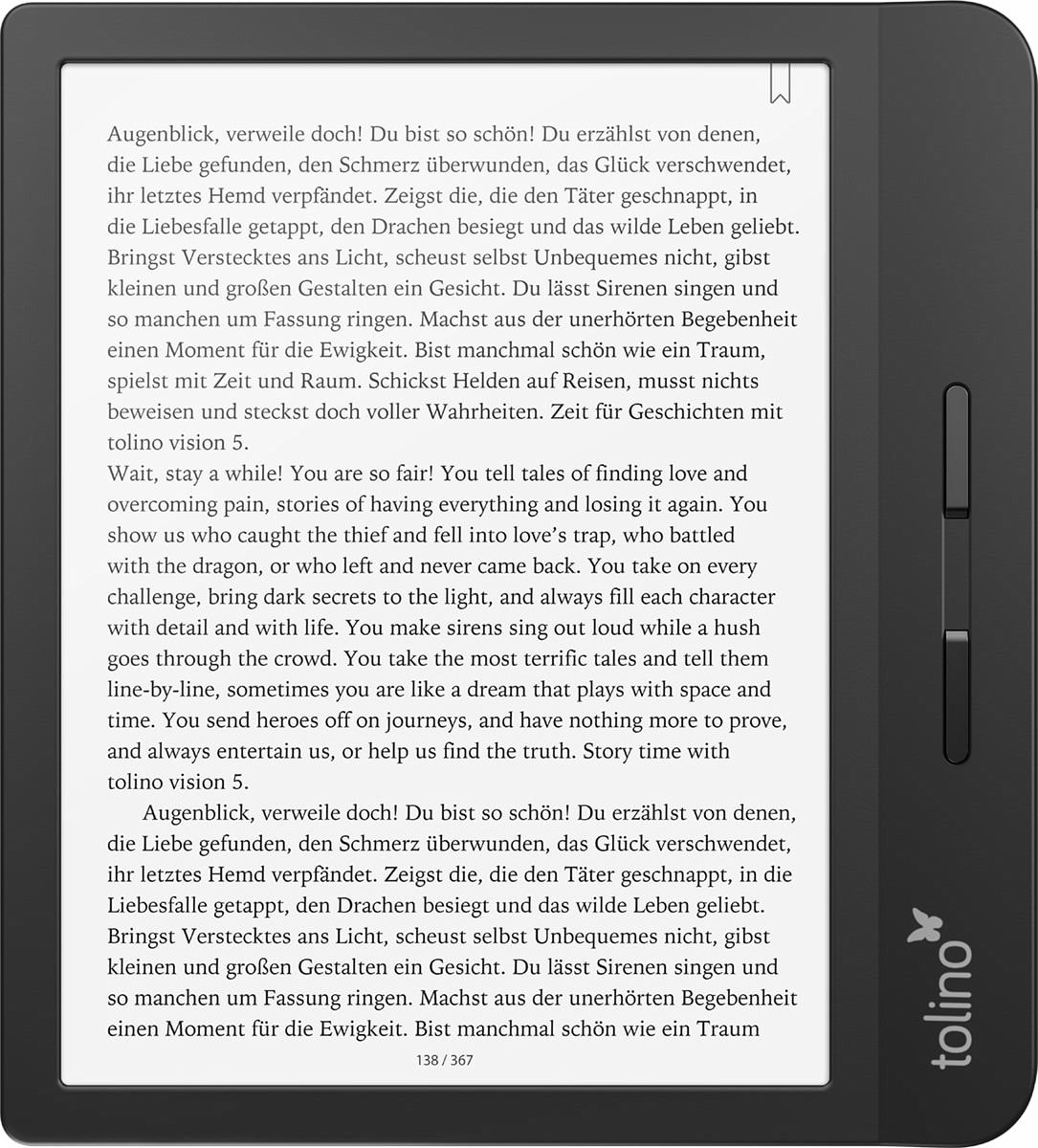 Mit dem Vision 5 rennt Tolino bei mir als Fan von seitlichen Blättertasten offene Türen ein. Er ist eine schöne Weiterentwicklung der bisherigen Vision-Reihe, deren abgerundetes Gehäuse mir auch gefiel. Nicht so begeistert bin ich von der Software, die nach zwei Firmwareupdates, die innerhalb von zwei Wochen nach dem Erscheinen geliefert wurde, noch immer etwas fehlerbehaftet ist. ...