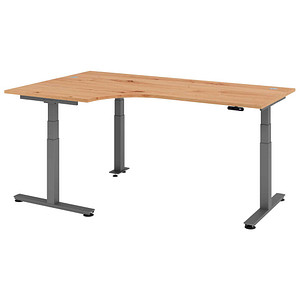 ,,Falls Ihr Tisch in einer Ecke seinen Platz finden soll, bietet sich der Hammerbacher Ergonomic Aktiv XDSM82 an. Die Spanplatte in Nussbaumoptik misst 200 x 120 cm und verfügt über eine Sitzaussparung. Sie können den Tisch bis zu 80 kg dynamisch bzw. 120 kg statisch belasten, er hält also einiges aus. Er bietet Höhen von niedrigen 62 bis hohen 127 cm und speichert bis zu vier Einstellungen. ..."