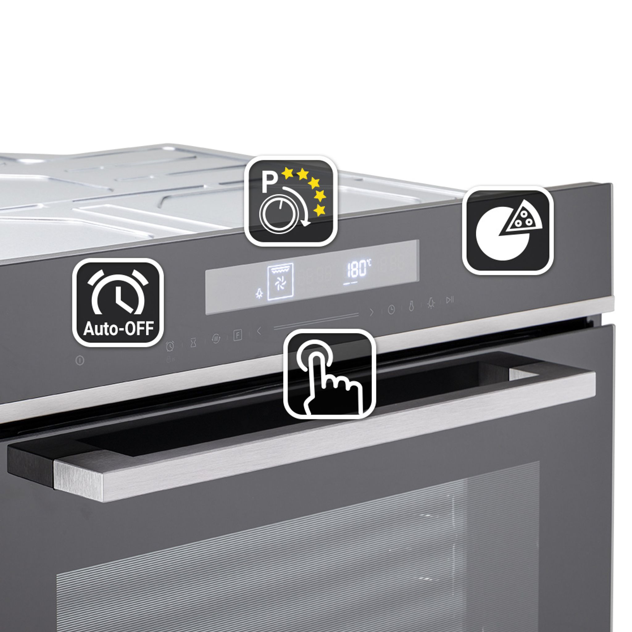 | Funktionen | TouchSelect Sensortasten, beschleunigtes Vorheizen, PowerAir Heißluft-Funktion, Pizzastufe, Auftaustufe, Niedertemperaturgaren (EcoCook-Modus). |