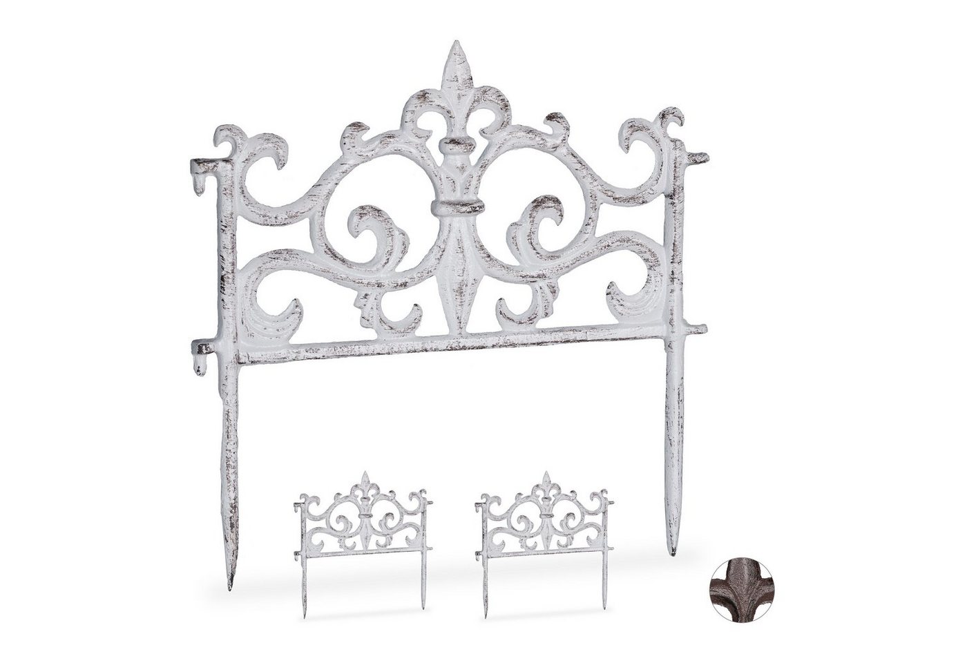 relaxdays Rasenkante 3 x Gusseisen Beetzaun weiß - Niedrige Beeteinfassung mit antiken Verzierungen