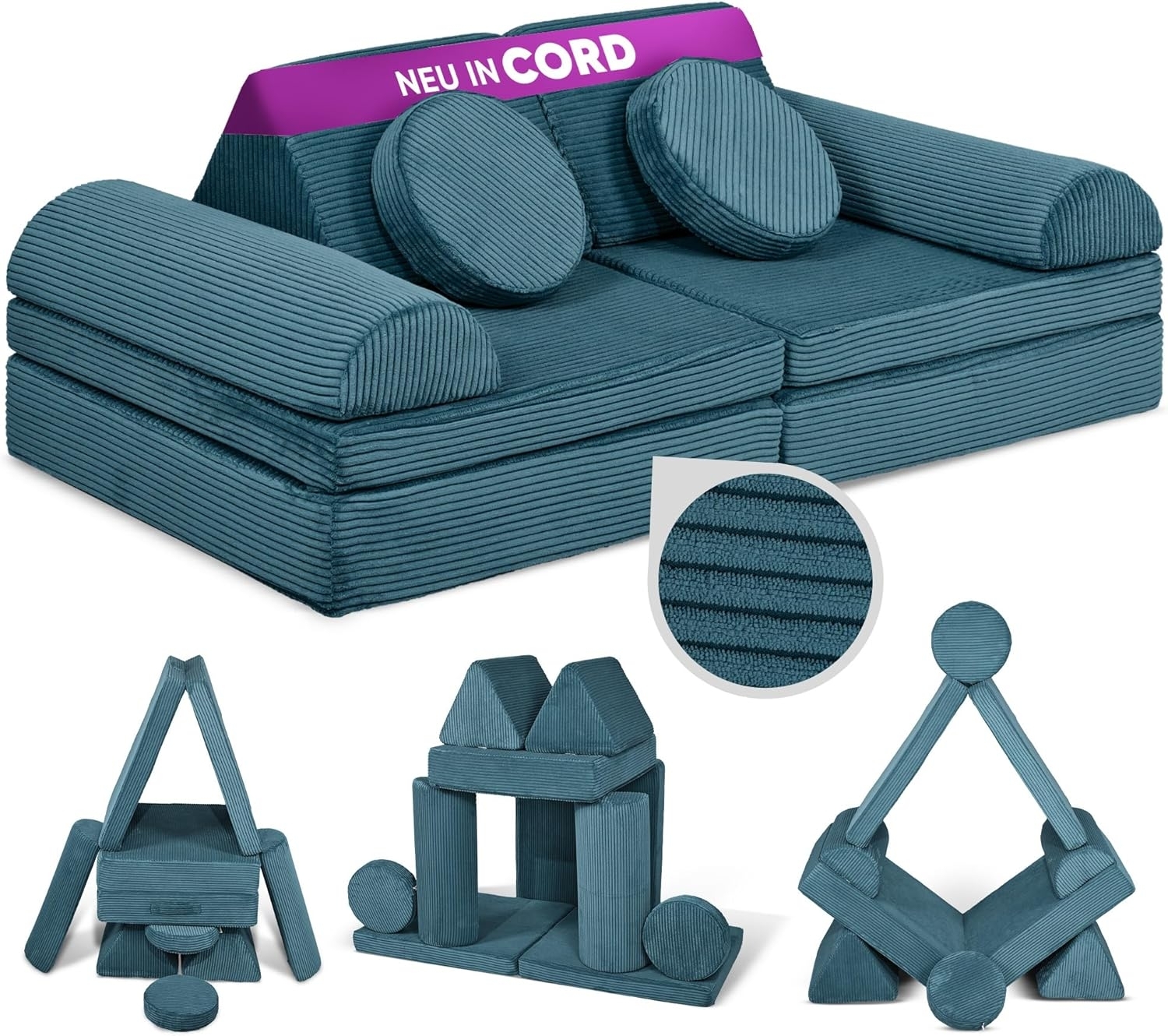 Das Linodino Kindersofa „Fantasiewelt“ ist ein kreativer Spielplatz für Ihr Zuhause. Mit zwei Klappmatratzen, zwei Dreieckskissen, zwei runden Kissen und zwei halbrunden Lehnen bietet es vielseitige Kombinationsmöglichkeiten. Der formstabile Schaumstoff sorgt für eine sichere und bequeme Unterlage. Die pflegeleichten Cord-Bezüge sind abnehmbar und waschbar. Mit einer Liegefläche von 150x66 cm eignet sich das Sofa auch als Gästebett. Genießen Sie die 3-jährige Garantie auf Formbeständigkeit. **Highlights** - Modularer Aufbau für kreative Spielmöglichkeiten - Formstabiler Schaumstoff für Sicherheit und Komfort - Abnehmbare, waschbare Cord-Bezüge - Integrierter, wasserdichter Unterbezug - 3 Jahre Garantie auf Formbeständigkeit **Produkteigenschaften** - Maße Liegefläche: 150x66 cm - Bezüge: Cord - Pflege: Maschinenwaschbar bei 30°C - Sicherheitsmerkmale: Versteckte Reißverschluss-Garagen **Lieferumfang** - 2x Klappmatratzen - 2x Dreieckskissen - 2x runde Kissen - 2x halbrunde Lehnen - Ausschluss von optionalem Zubehör