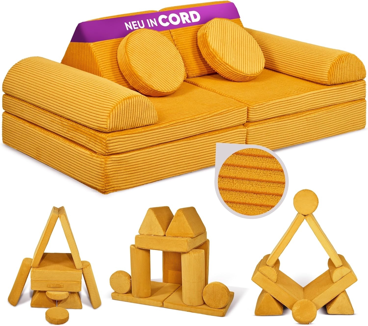 Das Linodino Kindersofa „Fantasiewelt“ ist ein kreativer Spielplatz für Ihr Zuhause. Mit zwei Klappmatratzen, zwei Dreieckskissen, zwei runden Kissen und zwei halbrunden Lehnen bietet es vielseitige Kombinationsmöglichkeiten. Der formstabile Schaumstoff sorgt für eine sichere und stützende Unterlage. Die pflegeleichten Cord-Bezüge sind abnehmbar und waschbar. Mit einer Liegefläche von 150x66 cm eignet sich das Sofa auch als Gästebett. Genießen Sie die 3-jährige Garantie auf Formbeständigkeit. **Highlights** - Modulares Design für kreative Spielmöglichkeiten - Formstabiler Schaumstoff für Sicherheit und Komfort - Abnehmbare und waschbare Cord-Bezüge - Integrierter, wasserdichter Unterbezug - 3 Jahre Garantie auf Formbeständigkeit **Produkteigenschaften** - Maße Liegefläche: 150x66 cm - Bezüge aus pflegeleichtem Cord - Sicherheitsmerkmale durch versteckte Reißverschlüsse - Vielseitig einsetzbar als Spiel- und Gästebett **Lieferumfang** - 2x Klappmatratzen - 2x Dreieckskissen - 2x runde Kissen - 2x halbrunde Lehnen