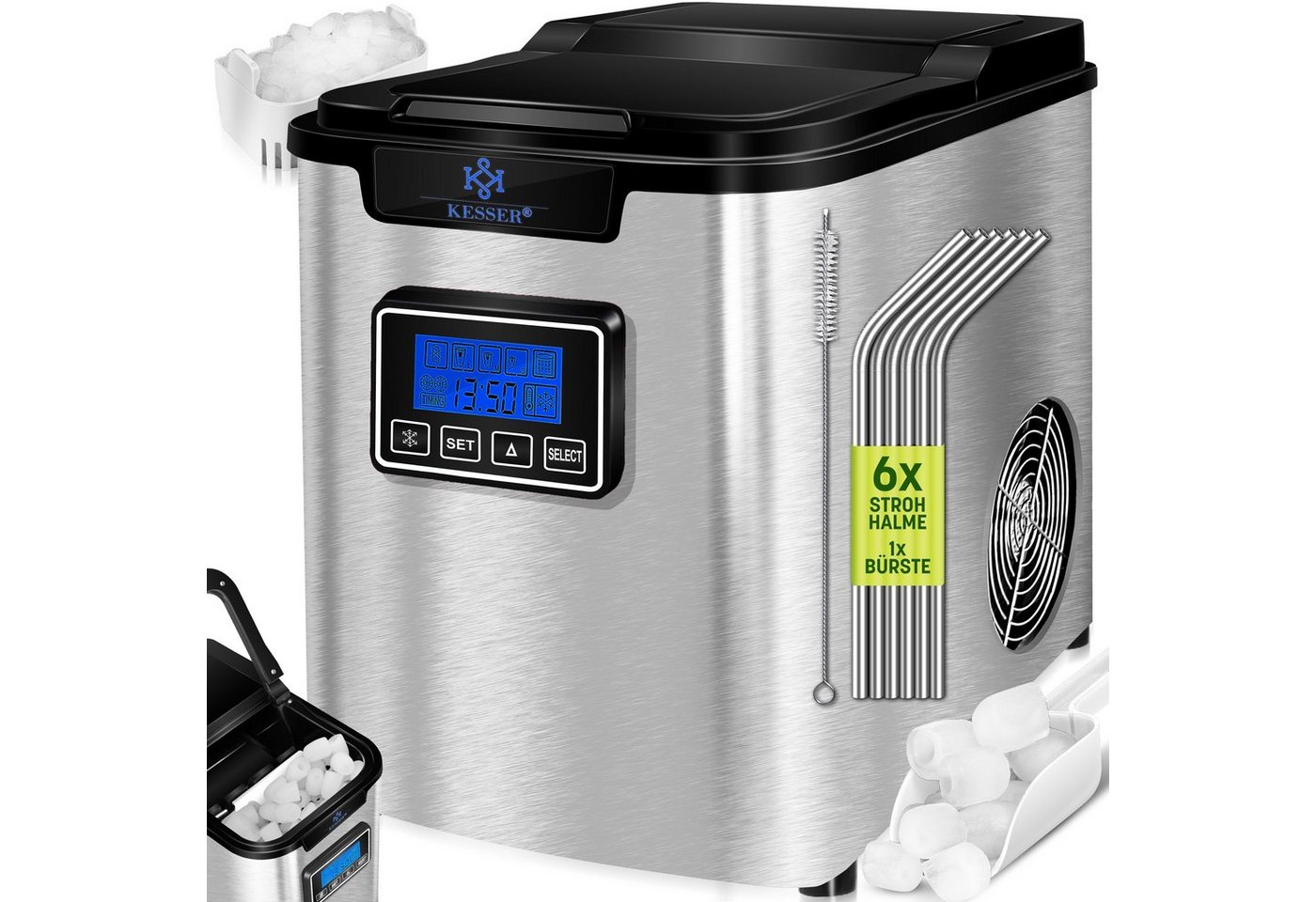 • Die innovative Eiswürfelmaschine von KESSER ermöglicht es, jederzeit kalte Getränke zu genießen, sei es auf Partys, im Büro oder einfach zwischendurch