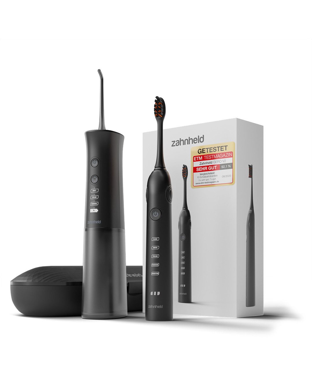 1x Handstück, 1x magnetische Ladestation, 1x Premium Lade-Reise-Etui, 1x Mini-Etui für Aufsteckbürsten, 1x ultimative Reinigung-Bürstenkopf, magnetische Aufbewahrungstasche