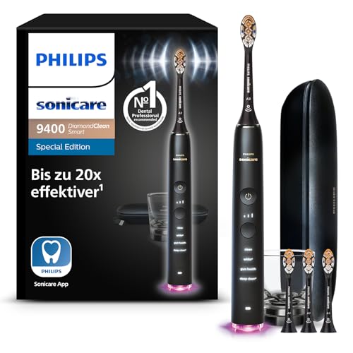 | Lieferumfang | 1 x Philips Sonicare DiamondClean Smart 9400 elektrische Zahnbürste, 1 x A3 Premium All-in-One-Bürstenkopf, 1 x Ladeglas, 1 x Reiseetui, 1 x USB-Ladegerät |