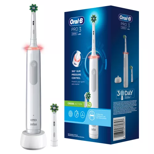 Die Oral-B Pro 3 3000 Cross Action White Elektrische Zahnbürste bietet eine effektive und gründliche Reinigung der Zähne. Mit vier Abschnitten für die Zahnreinigung und drei Putzprogrammen kann jeder individuelle Bedarf abgedeckt werden. Zusätzlich warnt ein rotes Licht bei zu starkem Druck, um Verletzungen am empfindlichen Zahnfleisch zu vermeiden.