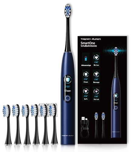 Die Tristan Auron Smart One Elektrische Schallzahnbürste bietet mit 48.000 Schwingungen eine gründliche Zahnreinigung und hat einen langlebigen Akku, der bis zu 6 Wochen hält. Ihr modernes Design und die gute Handhabung machen das Zähneputzen angenehm. Das praktische Display zeigt den Akkustand und den gewählten Modus an. Allerdings kann das Gehäuse bei Nässe rutschig sein, und die Aufsätze könnten weicher sein.