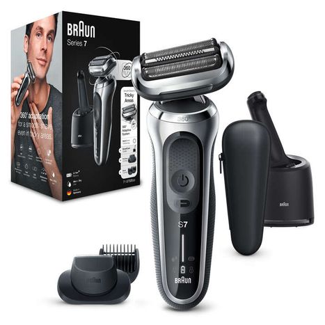 | Lieferumfang | 1x Series 7 Elektrorasierer für Herren, 1x Barttrimmer-Aufsatz, 1x Reinigungsstation, 1x Reise-Etui, 1x Netzteil mit automatischer Anpassung an 100 V bis 240 V, 1x Reinigungsbürste |