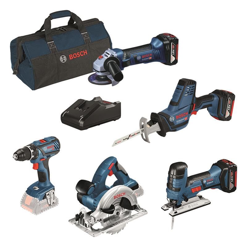 | Lieferumfang | 1 x Akku-Handkreissäge, 1 x Akku-Winkelschleifer, 1 x Akku-Bohrschrauber, 1 x Akku-Säbelsäge, 1 x Akku-Stichsäge, 1 x Schnellladegerät, 1 x Werkzeugtasche, 3 x 4 Ah Akku |