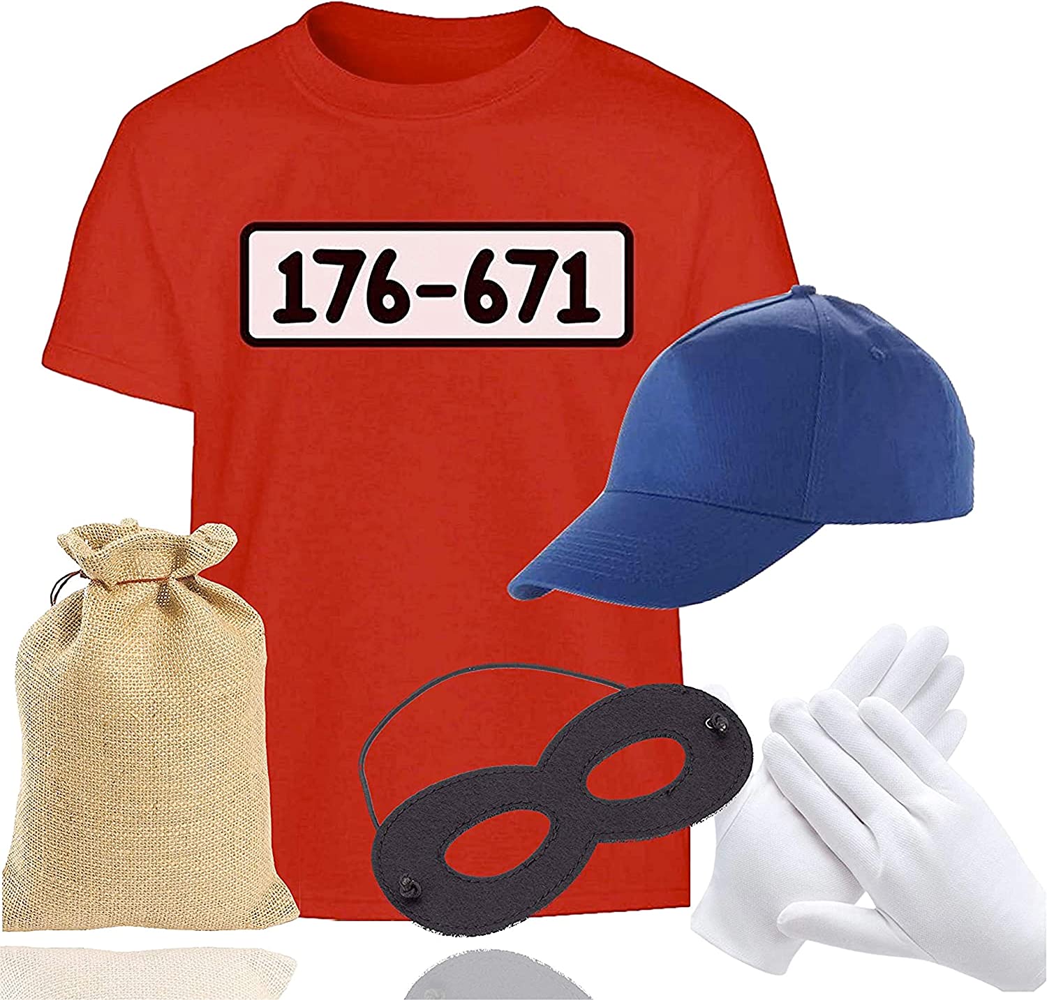 Gangster Set Panzerknacker Bandit Set bestehend aus Tshirt Shirt rot, Mütze Cap blau, Augenmaske, Handschuhe, Geldsack für Damen und Herren Kostüm Fasching & Karneval 1x Tshirt Shirt EINHEITSGROESS Ein rot wie GR Öß E L , mit Logo 176-671, passend für Erwachsene 170-190 cm, 1x Paar Handschuhe in weiß weiss 1x Schwarze Maske Bandit Augenmaske Zorro Räuber Einbrecher Dieb Bankräuber Panzerknacker Kostüm für Kinder und Erwachsene, 1x Cap Mütze Kappe Schildmütze in blau 2x Geldsack Sack als Accesoire Kostüm für Herren und Damen Erwachsene Perfekt geeignet als Kostüm für Fasching und Karneval als Bandit Augenmaske Zorro Räuber Einbrecher Dieb Bankräuber Panzerknacker Sie sind auf der Suche nach einem Gangster Safecracker Unisex T-Shirt mit Zubehör für Ihre nächste Kostümparty oder Maskerade Veranstaltung? Mit dem Gangster Safecracker Unisex T-Shirt Größe 170 - 190 cm Bandit T-Shirt mit Zubehör Einbrecher - Damen - Herren Kostüm Karneval & Maskerade Kostüm sind Sie bereit, die nächste Party als furchtloser Dieb zu besuchen. Mit Hose, Handschuhen, Hut und Maske sind alle Teile für ein unvergessliches Kostüm vorhanden. Dieses T-Shirt ist mit einer einzigartigen Grafik eines Gangster-Safeknackers gestaltet, die jeder Fan von Gangstern wiedererkennen wird. Es sind sogar winzige Bilder von Bargeld und Diamanten aufgedruckt, als zusätzlicher Touch! Es ist in Unisex-Größen von 170 bis 190 cm erhältlich, so dass du sicher eines finden wirst, das deinem Körperbau perfekt entspricht. Das Material selbst ist angenehm weich auf der Haut und sorgt für absoluten Komfort, egal wie lange du es trägst. Ob Halloween, Karneval oder Maskenball, mit diesem Kostüm sind Sie bestens gerüstet! Sie können es für Rollenspiele oder Fotoshootings verwenden; was auch immer die Situation sein mag, seien Sie sicher, dass dieses Kostüm die Blicke auf sich ziehen wird, wo immer Sie hingehen! Es ist auch eine schöne Geschenkidee, wenn Sie jemanden in Ihrem Leben haben, der sich auch gerne verkleidet. Holen Sie sich also dieses unglaubliche Banditen-T-Shirt noch heute, bevor es ausverkauft ist! Das Unisex-Kostüm eignet sich für Männer und Frauen mit einer Körpergröße von 170 bis 190 cm. Die fachmännisch geschnittene Passform verleiht dem Kostüm einen professionellen Touch, lässt aber auch genügend Bewegungsfreiheit für Raubüberfälle und Überfälle. Der leichte Stoff macht es einfach zu tragen, so dass es bequem genug ist, um die ganze Nacht hindurch in die Rolle zu schlüpfen, ohne dass man sich dabei unwohl fühlt oder schwerfälliges Material einen belastet. Sind Sie auf der Suche nach dem perfekten Kostüm, das das diesjährige Halloween und Karneval zu etwas ganz Besonderem macht? Dann ist das Gangster Safecracker Unisex Größe 170 - 190 cm Bandit Tshirt mit Zubehör Einbrecher - Damen - Herren Kostüm Karneval & Maskerade Kostüm-176-671 genau das Richtige für Sie. Das ist ein unverwechselbarer Look für jedes kriminelle Superhirn und wird eine großartige Ergänzung für Ihre Garderobe sein, Hersteller: TK Gruppe Timo Klingler