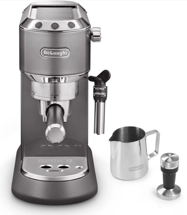 Die De'Longhi Dedica EC785.GY Espressomaschine in grau metallic kombiniert ansprechendes Design mit einer benutzerfreundlichen Bedienung und ermöglicht es, köstlichen Espresso und cremigen Milchschaum bequem zu Hause zuzubereiten. Dieses Barista-Set richtet sich sowohl an Einsteiger als auch an erfahrene Kaffeegenießer, die Wert auf Qualität legen.
