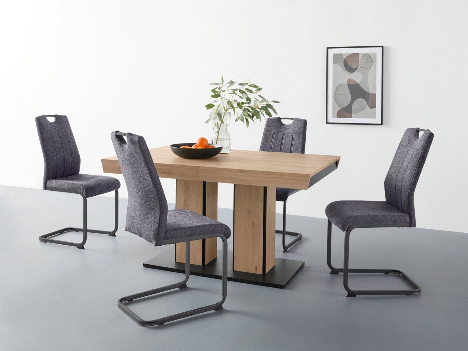 | Beschreibung | Die HELA Essgruppe Agnes bietet Ihnen einen ausziehbaren Esstisch, der von 140 cm auf 220 cm erweitert werden kann. Das 5-teilige Set umfasst vier bequeme Stühle mit einer Sitzhöhe von 49 cm. Die Kombination aus Holzwerkstoff und Metall sorgt für Stabilität und eine Belastbarkeit von 140 kg pro Sitzplatz. Die stilvolle Farbgebung in Braun und Anthrazit fügt sich harmonisch in Ihr Zuhause ein. **Highlights** - Ausziehbarer Tisch von 140 cm auf 220 cm für flexible Nutzung - Belastbarkeit von 140 kg pro Sitzplatz für hohe Stabilität - Bequeme Polsterung mit Schaumstoff für optimalen Sitzkomfort - Pflegeleichte Materialien, feucht abwischbar - Inklusive Aufbauanleitung für einfache Montage **Produkteigenschaften** - Maße Tisch (LxBxH): 140 x 90 x 76 cm (maximal 220 cm lang) - Maße Stuhl (BxTxH): 44 x 61 x 98 cm - Anzahl Sitzflächen: 4 St. - Material Tischplatte: Holzwerkstoff - Farbe Tischplatte: eichefarben - Material Gestell: Metall und Holzwerkstoff - Farbe Gestell: eichefarben schwarz - Bezug: Polyester Webstoff - Art der Polsterung: Schaumstoff - Lieferzustand: zerlegt **Lieferumfang** - 1 x Esstisch - 4 x Stühle - Lieferung ohne Dekoration - Aufbauanleitung inklusive |