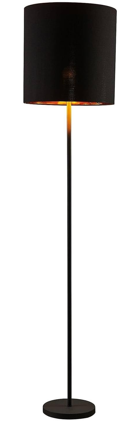 Die Stehlampe Nymar ist ein schönes Beleuchtungsobjekt für moderne Einrichtungen. Der Lampenschirm besteht aus Stoff in zylindrischer Form und ist außen schwarz, während die Innenseite golden getönt ist. So entsteht ein besonders gemütliches Licht für entspannte Stunden am Abend.