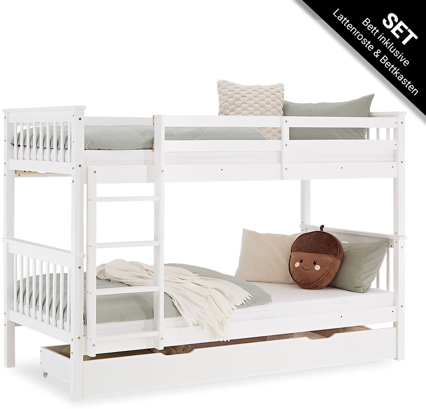 Clever schlafen und stilvoll verstauen: Dieses Etagenbett aus massivem Kiefernholz in zeitlosem Weiß bietet zwei bequeme Schlafplätze und eine große Schublade auf Rollen für praktischen Stauraum. Mit abgerundeten Kanten und einer umlaufenden Absturzsicherung auf der oberen Etage sorgt es für Sicherheit. Die Leiter ist flexibel montierbar, und das Bett kann unkompliziert in zwei Einzelbetten umgebaut werden. Inklusive passender Lattenroste für optimalen Liegekomfort. **Highlights** - Massives Kiefernholz in zeitlosem Weiß - Große Schublade auf Rollen für Stauraum - Flexibel montierbare Leiter - Umlaufende Absturzsicherung auf der oberen Etage - Umbaufähig zu zwei Einzelbetten **Produkteigenschaften** - Maße Liegefläche: 90 x 200 cm - Außenmaße (BxHxT): 208,5 x 144 x 99 cm - Nischenhöhe: 74,5 cm - Stauraumhöhe unter dem Bett: 22,5 cm - Einlegetiefe Matratze: 3 cm - Bettkantenhöhe: 31,5 cm - Breite Einstieg zur oberen Liegefläche: 39 cm - Höhe Rausfallschutz: 26 cm - Pfostenstärke: 50 mm - Materialstärke: 20 mm - Außenmaße Schubkasten (BxHxT): 196 x 17,5 x 63 cm - Innenmaße Schubkasten (BxHxT): 186 x 13 x 60 cm - Maximale Belastbarkeit: 120 kg je Liegefläche - Sicherheitsnormen: DIN EN747-1:2024; DIN EN747-2:2024 **Lieferumfang** - Bettgestell mit Bettkasten - Aufbauanleitung - Montagezubehör - Matratzen, Dekoration und Bettwäsche sind nicht im Lieferumfang enthalten - Das Bett und die Schublade werden zerlegt geliefert und erfordern Montage