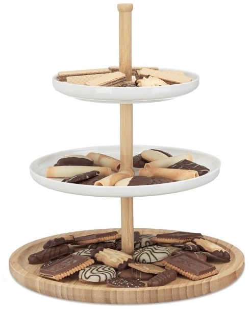 Die Relaxdays Etagere aus Bambus und Keramik ist die ideale Servierplatte für Kekse, Obst und Knabberzeug. Mit 3 Ebenen und einem Durchmesser von 30 cm bietet sie ausreichend Platz für eine Vielzahl von Leckereien. Der moderne Materialmix in Natur-Weiß sorgt für einen ansprechenden Look. Der gewölbte Rand und der zusätzliche Griff ermöglichen einen sicheren Transport. Die lebensmittelechten Flächen garantieren eine sichere Ablage für Ihre Snacks. **Highlights** - Etagere mit 3 Ebenen: Bietet ausreichend Platz für Gebäck, Chips oder Obst - Moderner Materialmix: Natürliches Bambus und Keramik in Braun und Weiß - Sicherer Transport: Gewölbter Rand und zusätzlicher Griff verhindern das Herunterfallen von Snacks - Lebensmittelecht: Geeignet für das Ablegen von Keksen, Knabbereien, Kuchen und mehr - Einfacher Aufbau: Mit wenigen Handgriffen zusammengeschraubt und bei Bedarf leicht auseinander genommen **Produkteigenschaften** - Abmessungen: D x H: 30 x 36 cm - Material: Bambus und Keramik - Farbe: Natur-Weiß - Anzahl der Ebenen: 3 - Gewölbter Rand an den Tellern - Zusätzlicher Griff für sicheren Transport - Lebensmittelecht **Lieferumfang** - 1 x Etagere - Mit Anleitung - Dekorationsartikel sind im Lieferumfang nicht enthalten