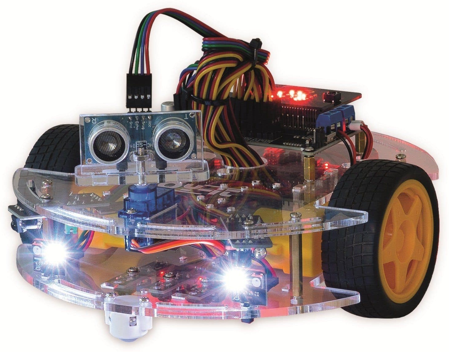 Das Joy-Car ist ein autonomer Educationroboter auf micro:bit-Basis und bietet eine umfangreiche Plattform um in die Themenbereiche Robotik, Elektronik und Programmierung einzusteigen. Es wird bereits fertig montiert (inclusive micro:bit V2) geliefert Das Joy-Car ist ein autonomer Educationroboter auf micro:bit-Basis und bietet eine umfangreiche Plattform um in die Themenbereiche Robotik, Elektronik und Programmierung einzusteigen. Es wird bereits fertig montiert (inclusive micro:bit V2) geliefert und ist sofort einsatzbereit. Durch die Verwendung des programmierfreundlichen BBC micro:bit, eignet sich das Joy Car bereits ab einem Alter von 8 Jahren, ist aber auch für ältere Jugendliche und elektronikbegeisterte Erwachsene durch seine üppige Sensorausstattung interessant. Sensoren wie Line-Tracking-, Ultraschall-, Infrarot- und Raddrehzahlsensoren ermöglichen Funktionen wie das autonome Fahren und sogar die Steuerung via BT über einen zweiten, separaten micro:bit. Die zusätzliche Ausstattung simuliert Blinker, Licht, Rückfahrlicht und Hupe und rundet damit das Erlebnis eines autonomen Roboterautos ab. Durch die Verwendung von adressierbaren LE Ds können zusätzlich individuelle Beleuchtungsszenarien realisiert werden. Ein kleines „Highlight“ ist der motorgesteuerte Ultraschallsensor, mit dessen Hilfe, sich das Joy-Car orientiert, nach links und rechts schaut, um so den günstigsten Weg zu ermitteln (Natürlich blinkt er dann, bevor er abbiegt und fährt weiter). Die 77 Seiten starke Anleitung (verfügbar in Deutsch und Englisch) erklärt nicht nur den Aufbau des Roboters. Alle Bauteile, Sensoren, Elektronik und Motoren, werden leicht verständlich in Ihrer Funktionsweise erklärt. Die Programmierung kann in Make Code oder in Micro Phyton erfolgen und wird detailliert beschrieben. Das Joy-Car hat bereits in diversen Klassenzimmern seinen Einsatz gefunden und ist dementsprechend erprobt. Durch seine umfangreichen und vielseitigen Funktionen, die in der Anleitung aufgegriffen und ansprechend Erläutert werden, kann das Joy-Car in den verschiedensten Unterrichtsformaten eingesetzt werden. Dabei kommen weder die Themen der Informatik, noch der Physik oder Robotik zu kurz! Auf der gleichnamigen, speziell für das Joy-Carerstellten Homepage werden weitere Information, Tips, Programmierbeispiele und ein Forum für Fragen, Probleme und Ideen geboten. Video: be/8f T Ds Jc E Or M