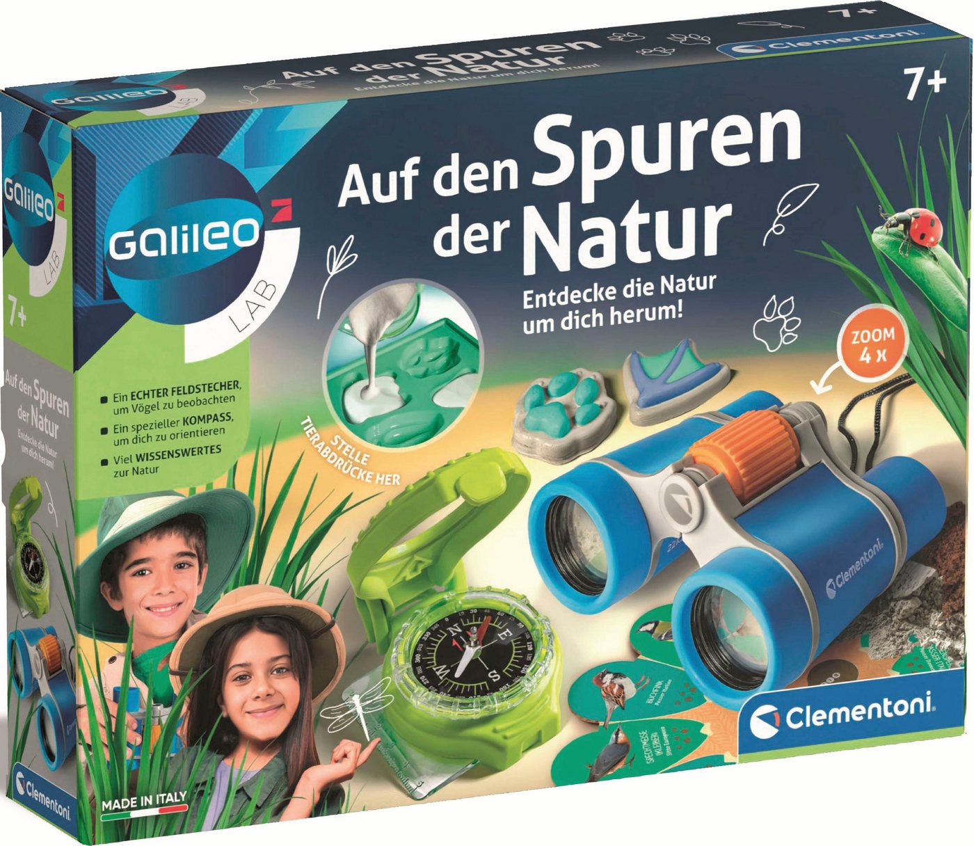 Clementoni® Experimentierkasten GalileoAuf den Spuren der Natur, Made in Europe - Outdoor-Spaß mit Fernglas, Kompass und Naturposter