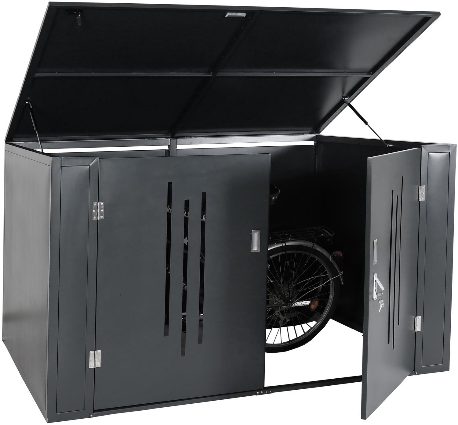 Die 4er-Fahrradgarage HWC-K64 bietet Ihnen einen sicheren und geschützten Unterstand für bis zu vier Fahrräder. Mit großzügigen Abmessungen von 121 x 202 x 150 cm und einem stabilen Korpus aus verzinktem Stahl schützt sie Ihre Räder vor Diebstahl und Witterungseinflüssen. Der Deckel mit hydraulischer Gasdruckfeder ermöglicht ein müheloses Öffnen, während die abschließbaren Türen für zusätzliche Sicherheit sorgen. Eine praktische Hakenleiste mit 4 Haken sorgt für Ordnung. **Highlights** - Schutz vor Diebstahl durch abschließbare Türen - Deckel mit hydraulischer Gasdruckfeder - Bequeme Unterbringung ohne störende Querstreben - Abschließbar (Schlüssel oder Sicherheitscode) - Hakenleiste mit 4 Haken **Produkteigenschaften** - Maße (HxBxT): 121 x 202 x 150 cm - Innenmaße: 112 x 198 x 142 cm - Höhe mit geöffnetem Deckel: 183 cm - Breite mit geöffneter Tür: 321 cm - Wandstärke: 1,0 mm - Material: Griff Deckel: Edelstahl, Griff Tür: Alu, Korpus: verzinkter Stahl, Gasdruckfeder: Stahl, Schrauben: Edelstahl, Scharniere: Edelstahl, Schloss: Kunststoff + Zink - Farbe: Anthrazit - Aussparungen für Luftzirkulation **Lieferumfang** - 4er-Fahrradgarage HWC-K64 - Montageanleitung - Ausschluss: Transport in die Wohnung oder Aufbau der Ware