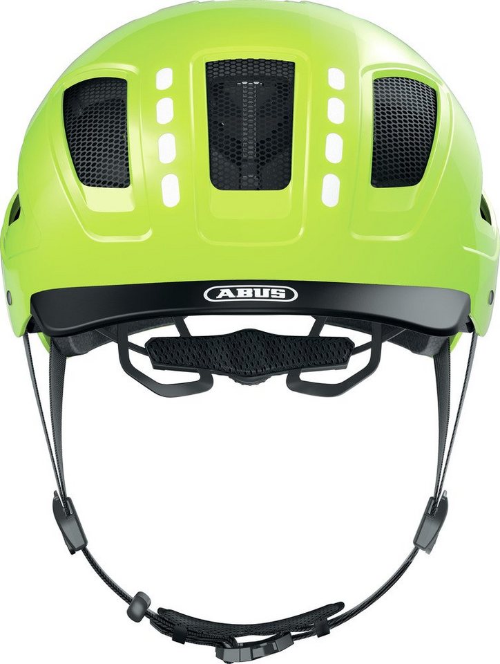 ABUS Hyban 2. 0 LED - gut sichtbar durch die Dunkelheit Der Hyban 2. 0 LED ist, wie der Name bereits verrät, ein cooler Fahrradhelm mit LED-Licht. Die LED-Version des urbanen Helmes ist sowohl mit Rücklichtern als auch mit Licht an der Vorderseite ausgestattet. Perfekt für Fahrten in der Dämmerung und Dunkelheit. Mit dem City-Helm sind Sie gleich doppelt gesichert: Zum einen durch die robuste Hartschale und zum andern durch die hohe Sichtbarkeit. Der Hyban 2. 0 LED ist der ideale Begleiter für den Alltag und dient als zuverlässiger Kopfschutz auf dem Weg zur Arbeit oder unterwegs in der Stadt. Dabei bietet der Helm einen hohen Tragekomfort, wozu der Vollring im Inneren des Helmes beiträgt. Dieser umschließt den Kopf vollständig und lässt sich über das Verstellrad einstellen. So kann die optimale Passform ermittelt werden. Hinzu kommen die Luftlöcher, die einen Hitzestau unter dem Helm vermeiden. Selbst für Zopfträger oder Zopfträgerinnen eignet sich dieser Helm, da das höhenverstellbare Verstellrad Platz für den Zopf schafft. So drückt der Helm nicht mehr auf den Zopf und unangenehme Kopfschmerzen werden vermieden. Weiter Produkt-Vorteile:• LED-Licht: per Micros USB schnell aufladbar• robuster Helm: schlagfeste, gespritze ABS-Außenschale kombiniert mit stoßabsorbierendem Hartschaum (EPS)• 360° Sichtbarkeit - dank Reflektoren und LED Vorder- sowie Rücklicht• 3 Leuchtmodi: Eco Mode, Eco Flash Mode (blinkend) und Power Flash Mode (blinkend)• Fliegennetz: dient in den vorderen Luftlöchern als Schutz vor Insekten• Belüftung: 5 Luftein- und 8 Luftauslässe sorgen für optimale Ventilation