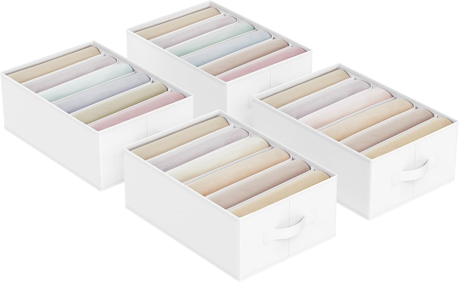 ##### Info zu diesem Artikel - 【FÜR MEHR ORDNUNG】Diese Aufbewahrungsboxen helfen Ihnen, die Kleidung nach Art zu sortieren und den Kleiderschrank zu ordnen, damit Sie das benötigte Kleidungsstück schnell finden können - 【STABIL & STAPELBAR】Die Seitenwände und der Boden werden mit Karton verstärkt, damit Sie die Ordnungsboxen stabil übereinanderstapeln können, um Platz im Schrank optimal auszunutzen. Dank 2 Einsteckplatten lassen sich die Boxen schnell aufstellen - 【GROßE FÄCHER】Jeder Schubladen-Organizer ist 42 x 30 x 17 cm groß und hat sechs 7 cm breite Fächer, die viel Stauraum für Ihre Jeans, Pullover oder andere Accessoires bieten - 【EINFACHER ZUGRIFF】Die Kleiderschrank-Organizer haben jeweils einen Griff und lassen sich leicht herausziehen, egal ob Sie sie im Kleiderschrank oder auf dem Regal platzieren, um das benötigte Kleidungsstück zu finden - 【VIELSEITIG EINSETZBAR】Die Faltboxen passen perfekt in Ihren Kleiderschrank, in eine große Schublade, auf das Aufbewahrungsregal oder unter das Bett. Bei Nichtgebrauch können Sie sie zusammenfalten und platzsparend verstauen **Produktdetails:** - Farbe: Wolkenweiß - Material: Vliesstoff 80 g/m², Karton - Größe jeder Box: 42 x 30 x 17 cm (T x B x H) - Gewicht von 4 Boxen: 1,7 kg **Lieferumfang:** - 4 x Kleiderschrank-Organizer - 8 x Einsteckplatte