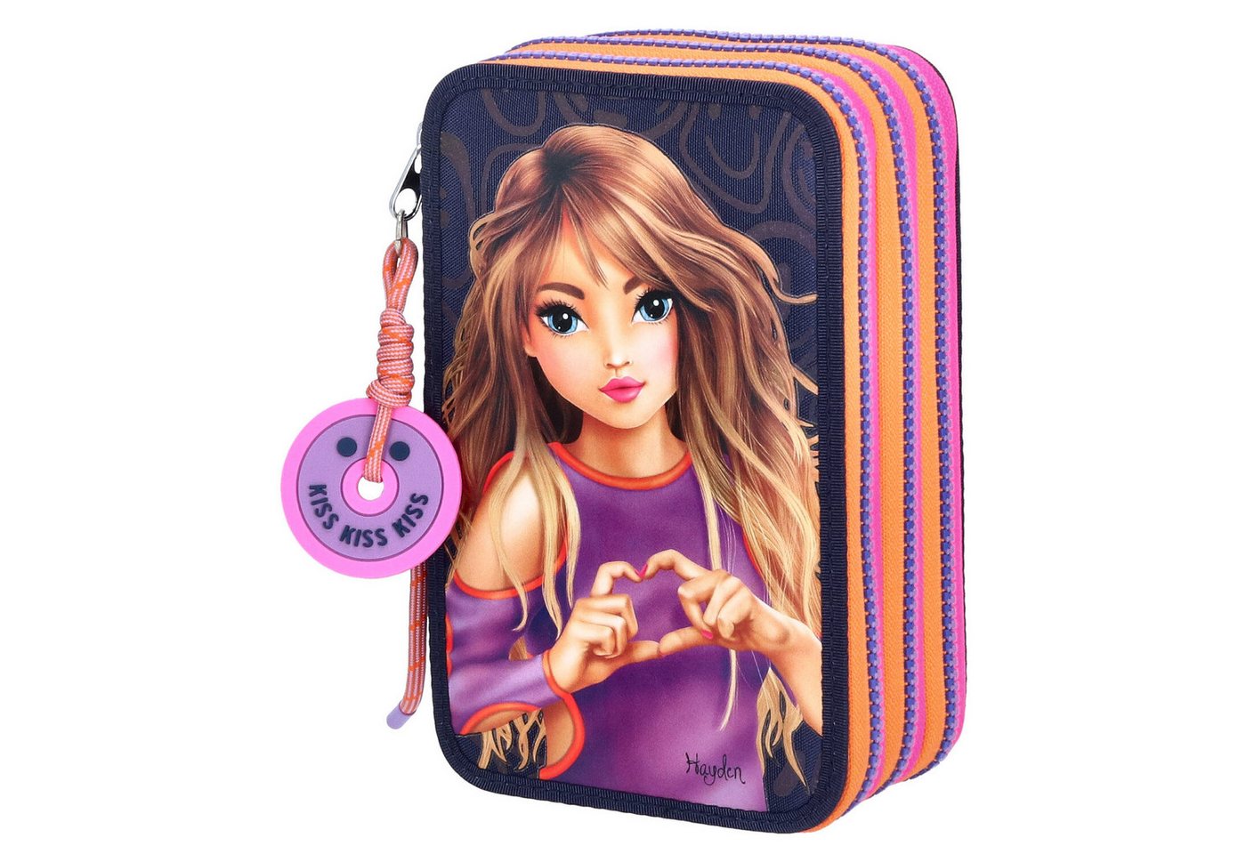 • Entdecken Sie die stilvolle dunkelblaue 3-Fach-Federtasche von TOPModel mit einem großen Model-Motiv und coolen Lach-Emojis, die im Licht schimmern