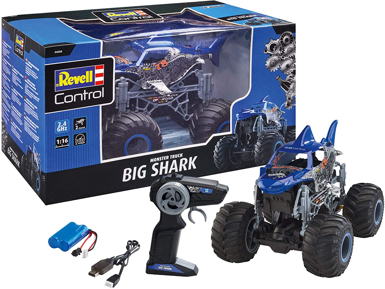 | Name | Revell Control 24558 RC Monster Truck Big Shark, Hai Design, 2.4 GHz, für Recht-und Linkshänder, bullige Reifen, Li-Ion-Akku, 32,5 cm ferngesteuertes Auto, blau |