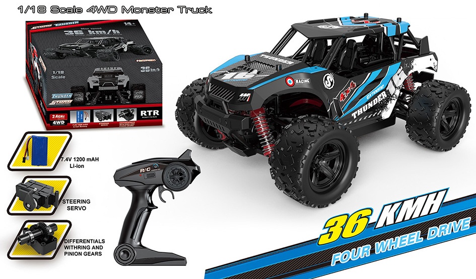 RC Monster Truck "Thunder 312" 1:18 inkl. Li Ion Akku und 2,4 Ghz RC-Anlage. Alle zum Betrieb nötigen Teile sind enthalten. Der Motor ist bereits montiert! Er hat Stoßdämpfer vorne und hinten. Allradantrieb mit luftgefüllten Offroad-Reifen aus Gummi. Karosserie besteht aus crashsicherem Lexan! RTR - fertig gebaut und in sofort einsatzbereit! Die robuste Karosserie im Maßstab 1:18 ist fertig lackiert und mit Schutzfolie beklebt. Die Fernbedienung, Empfänger, Servos etc. sind bereits enthalten und betriebsfertig eingebaut. Mit 2,4GHZ RC Anlage, Servo und ESC Allgemeine Informationen: Motor: 380er Hochleistungsmotor Mit 17G Servo für proportionale Lenkung 25A ESC Max. Geschwindigkeit: ca. 36km/h Karosserie: aus Lexan Allradantrieb 7,4V 1200 m Ah Li Ion Akku Stoßdämpfer ??? 4x4 - Allradantrieb Farbe: Schwarz Fernbedienun Vollproportional: Rechts/links,vorwärts/rückwärts. Dosierbare Regelung der Geschwindigkeit 2,4 Ghz Profi Fernsteuerung. Auf der Fernsteuerung kann man Lenkung und Gas trimmen/einstellen. Abmessungen: Länge: 260mm Breite: 185mm Gewicht: 650g Lieferumfan RC Auto "Thunder 312" Profi-Pistolenfernbedienung 2,4 Ghz vollproportional Motor und Regler 2,4 Ghz Empfänger 7,4V 1200 m Ah Li Ion Akku USB- Ladekabel