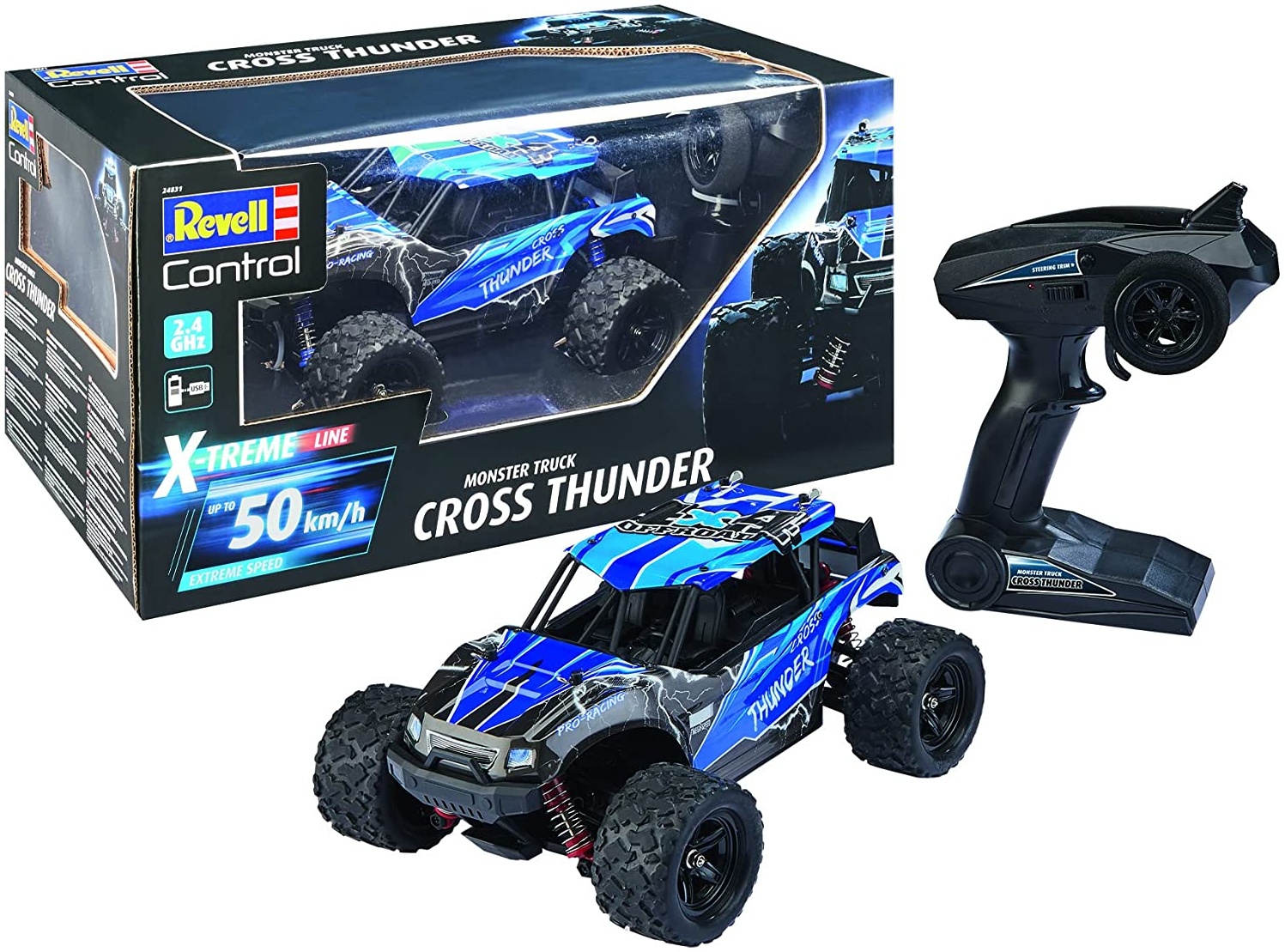 | Name | Revell Control 24831 X-Treme schneller RC Truggy Cross Thunder, 2.4 GHz, proportional, 4WD Allrad, geländegängig, bis zu 50 km/h ferngesteuertes Auto, Blau |