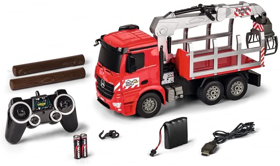 | Name | Carson 500907315 500907315-1:20 MB Arocs Holztransporter 100% RTR, Ferngesteuertes Fahrzeug, Baufahrzeug mit Funktionen Licht und Sound, inkl. Batterien und Fernsteuerung, rot |