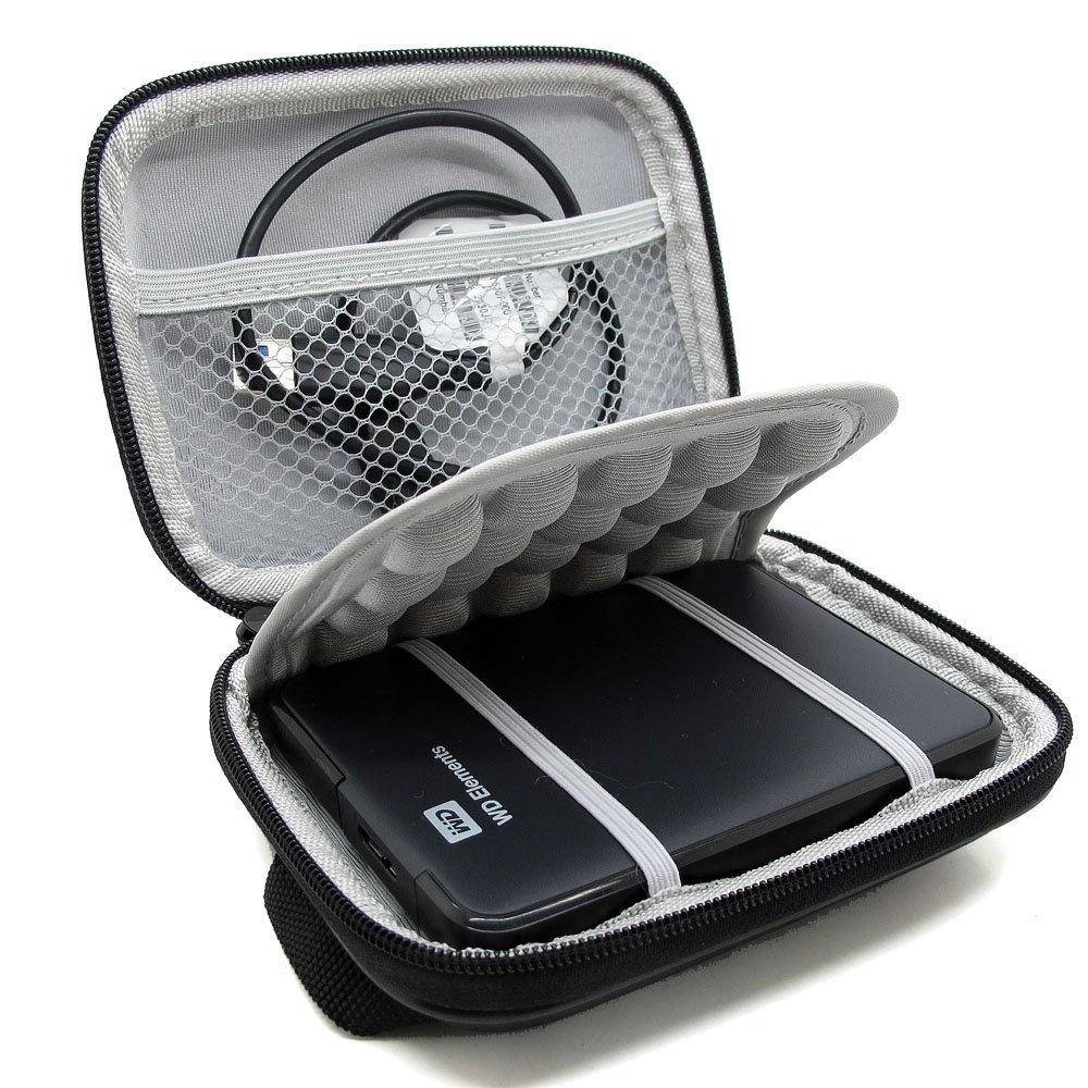 Die schwarze Schutzhülle bietet einen zuverlässigen Schutz für externe Festplatten und sorgt dafür, dass sie sicher aufbewahrt werden können. Mit zusätzlichen Fächern für Zubehör wie Kabel und Speicherkarten ist die Tasche praktisch gestaltet und ermöglicht eine organisierte Aufbewahrung.