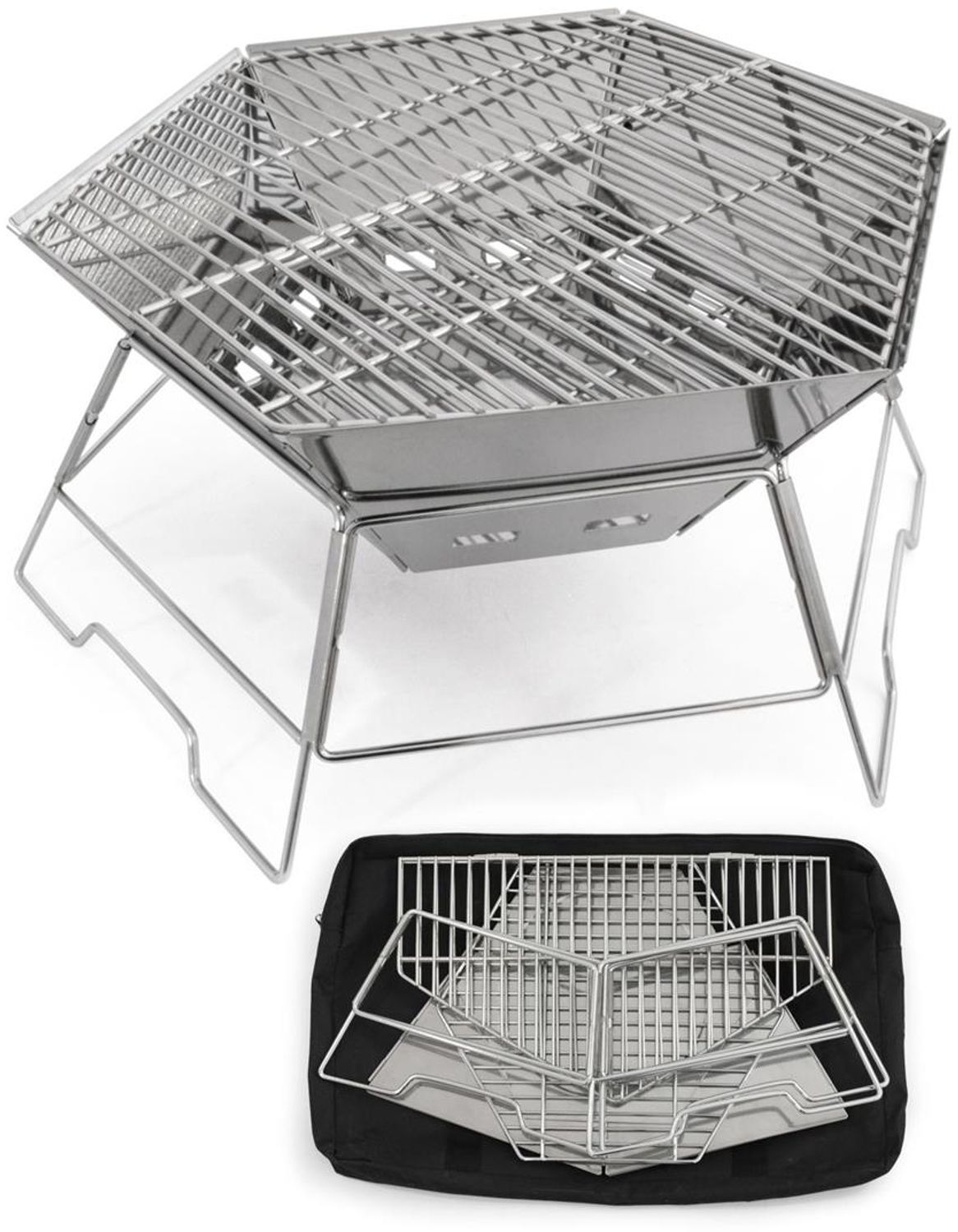 Origin Outdoors Grill- und Feuerschale 'Hexagon', 40 x 45 cm Kompakter und praktischer Grill mit großer Grillfläche. Die sechseckige, zusammenfaltbare Bauweise begünstigt das kompakte Packmaß, ermöglicht einen schnell Auf- und Abbau und steht stabil am Boden. Durch seine Bauweise ist er auch als Feuerschale verwendbar. Weiterhin verfügt der Grill über eine einlegbare Bodenplatte, einen Kohlerost und einen großen, mittig zusammenklappbaren, Grillrost. Die faltbaren Wandsegmente sind wie ein Windschutz konstruiert und schützen die Glut vor starkem Wind. Die in den Wandsegmenten eingearbeiteten Luftlöcher befinden sich unterhalb des Kohlerosts und versorgen die Glut so perfekt mit Sauerstoff. Die Tragetasche aus Nylon ist im Lieferumfang enthalten. - Edelstahl 430 - Grillfläche 40 x 45 cm - Gewicht 3.150 g - Aufbaumaß 45 x 52 x 22,5 cm (Höhe) - Packmaß 28 x 51 x 6 cm - Transporttasche Nylon - Inkl. Grillrost (Edelstahl 201) und Kohlerost