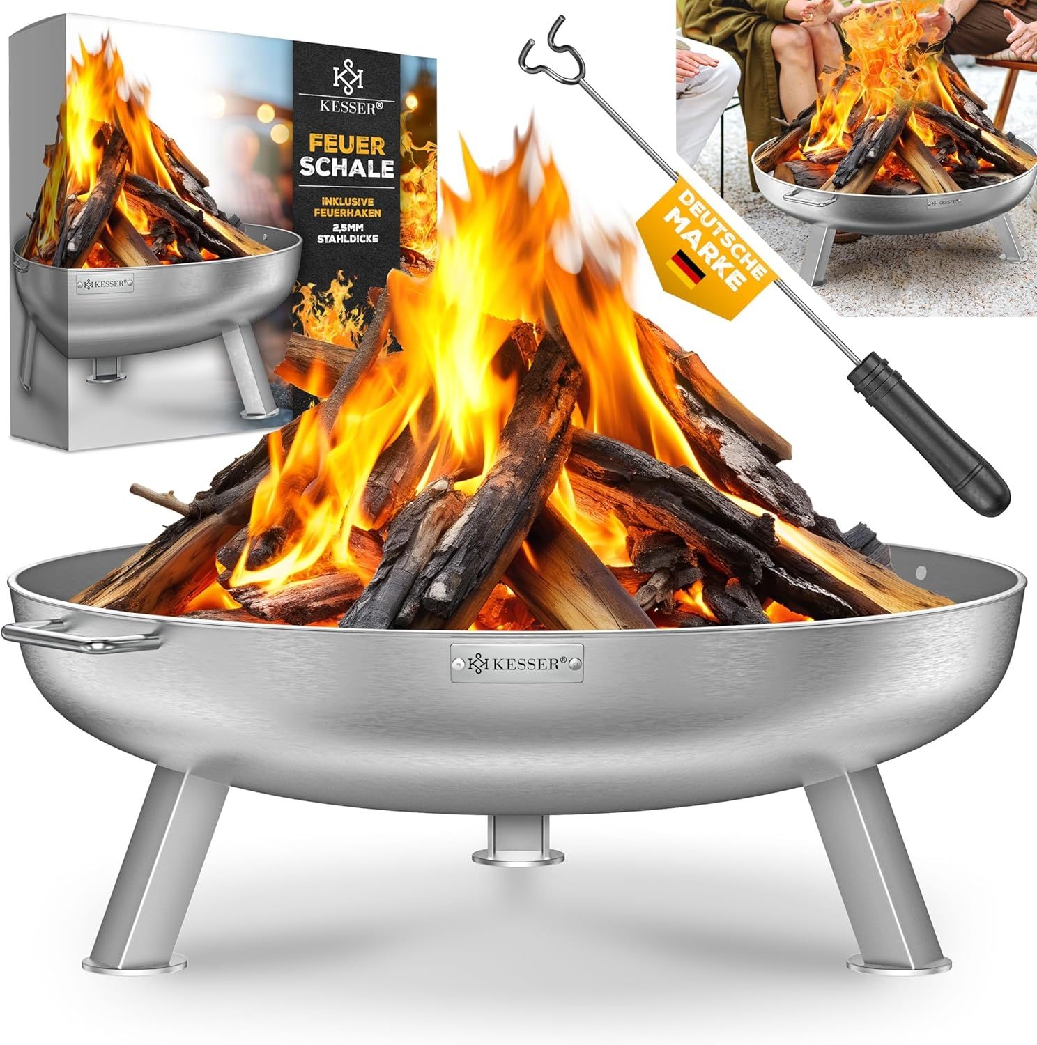**KESSER® Feuerschale mit 2,5 mm Stahldicke inklusive Feuerhaken aus massivem Gusseisen, mit Wasserablauf und 2 stabilen Griffen wahlweise in Edelstahl oder legiertem Stahl**