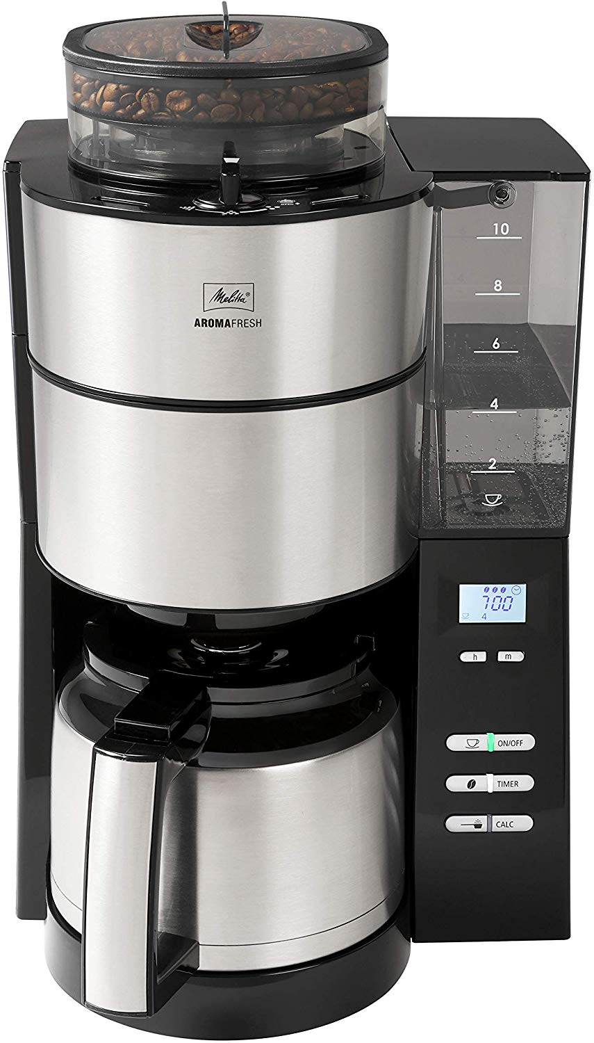 Die Melitta 1021-12 AromaFresh Filter-Kaffeemaschine mit integriertem Mahlwerk ist eine gute Maschine mit einfach zu bedienendem Timer und leisem Mahlwerk. Die Einstellung der Tassenmenge und des Mahlgrades beeinflussen die Stärke des Kaffees. Die Thermoskanne schließt gut und gießt gut aus. Einige Kunden vermissen eine Automatik für die Menge an Pulver zur Wassermenge.