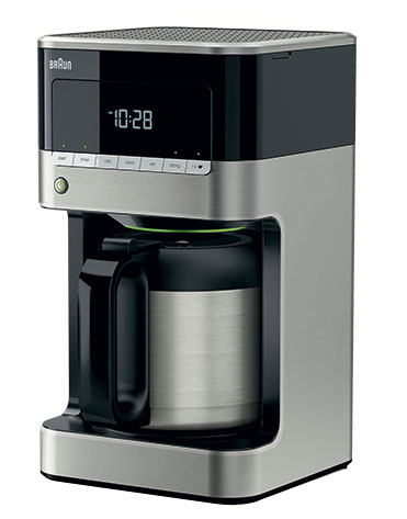 Mit Uhr. Startzeit programmierbar. Entkalkungsprogramm mit Anzeige, wann Entkalken nötig. Hält nicht lange warm. Wasserstand kaum sichtbar. Strong-Taste. Schmeckt bei acht Tassen etwas wässrig, der Nachgeschmack des Kaffees ist bei drei Tassen süßlicher als bei acht Tassen.