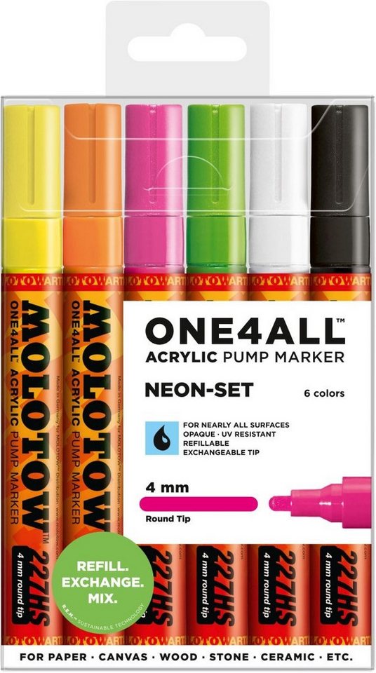 MOLOTOW Permanentmarker ONE4ALL 227 HSNachfüllbar, wasserfest, Rundspitze, 6er Etui (neongelb, neonorange, neonpink, neongrün, signalweiß, signalschwarz)