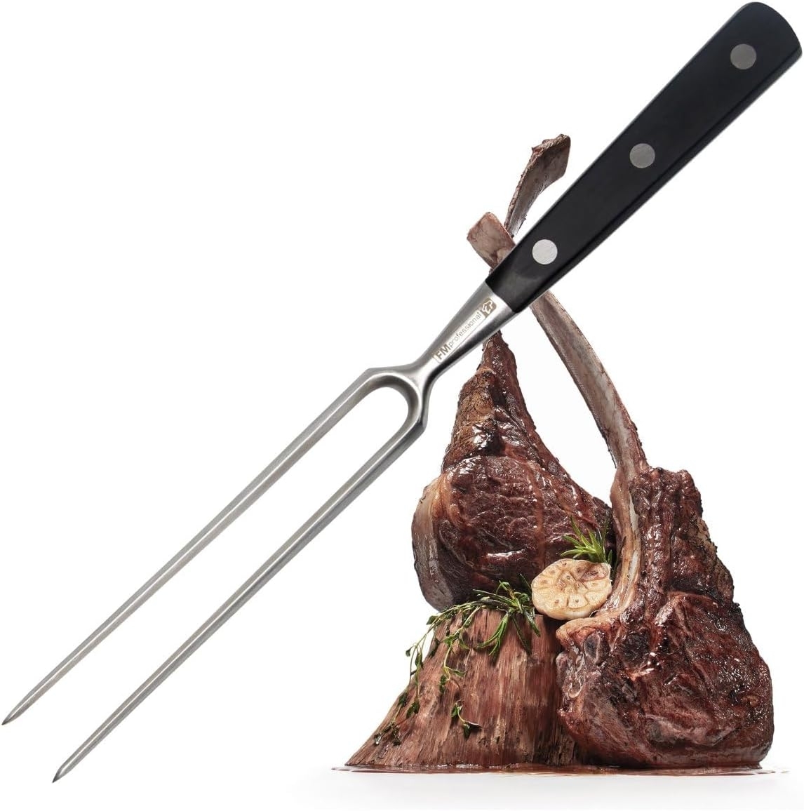 Die FMprofessional Fleischgabel ist ein unverzichtbares Küchenwerkzeug, das sich ideal zum Tranchieren von Fleisch und für den Grill eignet. Mit einem geschmiedeten Funktionsteil aus hochwertigem Edelstahl und einem handlichen Kunststoffgriff bietet sie eine robuste und langlebige Lösung. Die Gabel hat eine Länge von 30 cm und lässt sich leicht per Hand reinigen. **Highlights** - Robuste Fleischgabel mit geschmiedetem Funktionsteil - Handlicher und fester Griff für eine sichere Handhabung - Lange Zinken für das Bearbeiten großer Braten - Ergonomischer Griff für komfortables Arbeiten - Leichte Reinigung per Hand **Produkteigenschaften** - Farbe: Schwarz-Silber - Material: Griff aus Kunststoff, Funktionsteil aus Edelstahl - Abmessungen: ca. 30 x 1 x 2,5 cm **Lieferumfang** - 1 x FMprofessional Fleischgabel